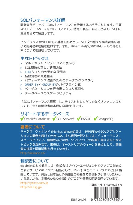 インデックスやWHERE句の基礎を始めとし、「SQLパフォーマンス詳解」では、SQL文の様々な構成要素を通じて開発者の理解を助けます。また、HibernateなどのORMツールの落とし穴についても説明しています。