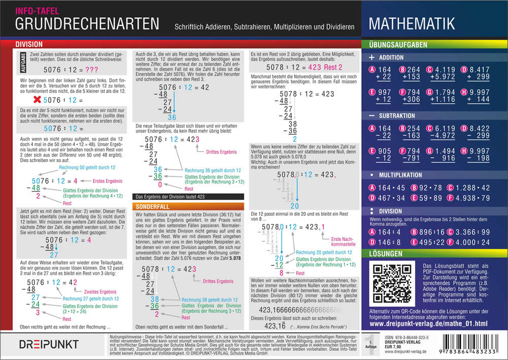 | Schlagworte | Addieren • Dividieren • Dreipunkt • Dreipunkt-Verlag • Grundrechenarten • Grundschule und Sekundarstufe I • Info-Tafel • InfoTafel • Lernen • Mathematik • Multiplizieren • Rechnen • Rechnen; Nonbooks • Schriftlich Rechnen • Schule • Schulen • Schüler • Subtrahieren |
