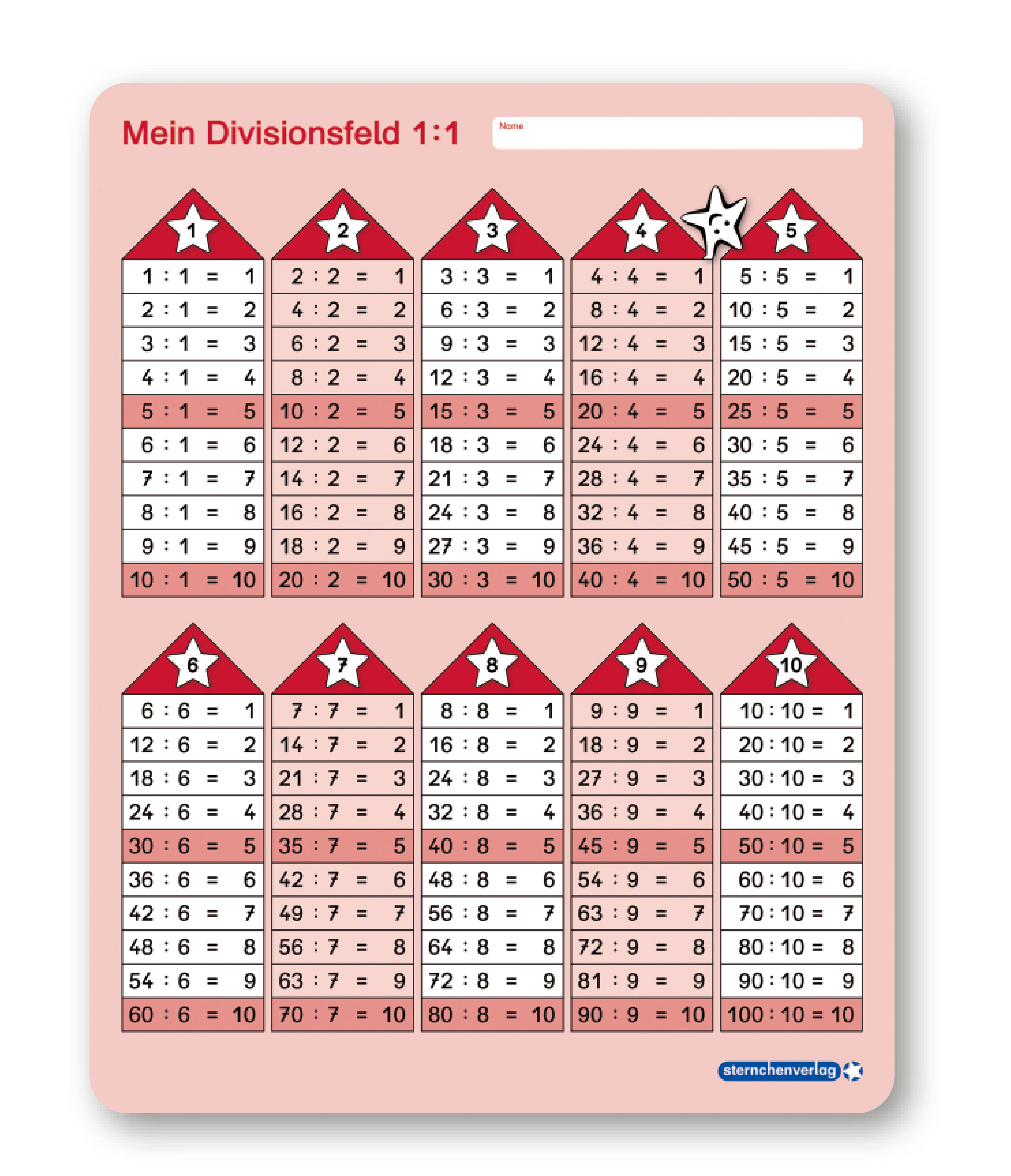 Jedes Kind kann auf der Rückseite die Felder ausfüllen und sich selbstgesteuert kontrollieren mit Hilfe der Vorderseite. Hier können die Divisionsreihen immer wieder geübt werden.