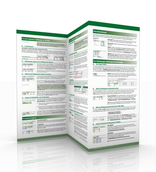 Diese Wo&Wie Arbeitshilfe „Excel 2016 – Formeln und Funktionen“ behandelt im praktischen Faltkarten-Format die wichtigsten Themen wie: