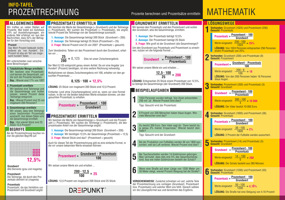 | Schlagworte | Dreipunkt • Dreipunkt-Verlag • Dreisatz • Drei-Satz • Dreisatzrechnen; Einführung • Grundschule und Sekundarstufe I • Info-Tafel • InfoTafel • Lernen • Mathematik • Prozent • Prozente • Prozentrechnen • Prozentrechnung • Rechnen • Schriftlich Rechnen • Schule • Schulen • Schüler |