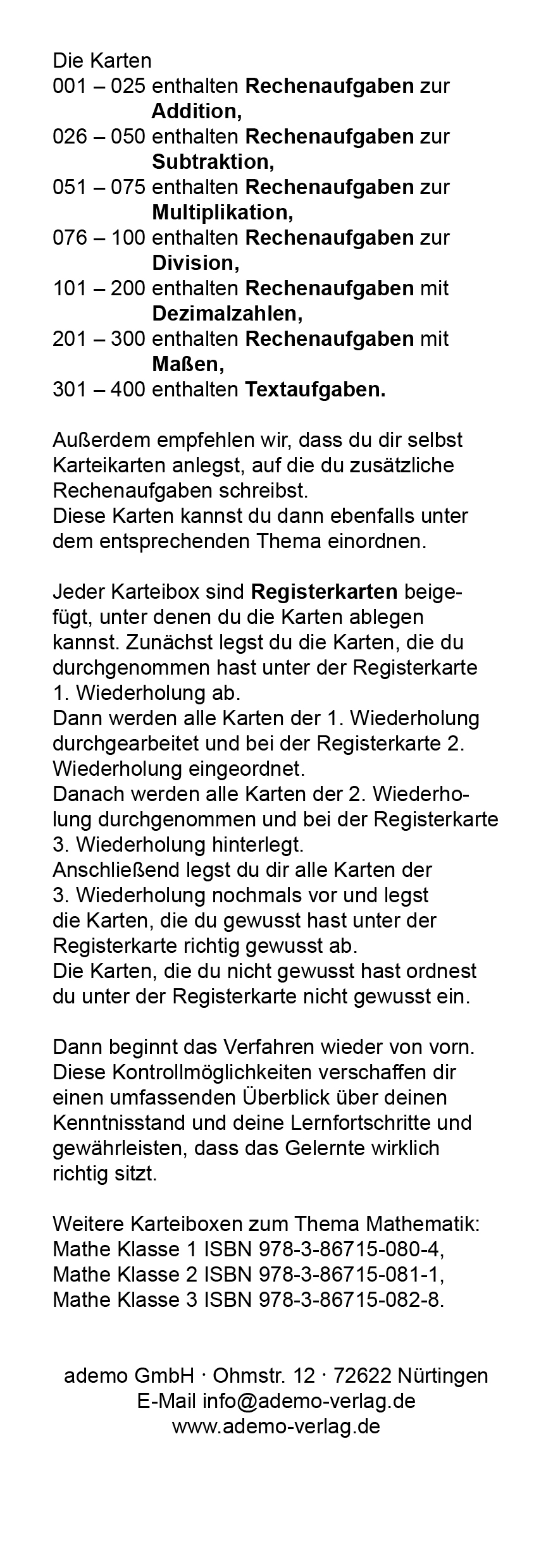 Die Karteibox Mathe Klasse 4 enthält 400 farbige Karteikarten mit vielen Rechenaufgaben, Einsetzübungen und Erklärungen zum Thema Addition, Subtraktion, Multiplikation, Division Dezimalzahlen, Maßeinheiten und Textaufgeben. Jetzt neu mit lustigen Mecki-Stickern.