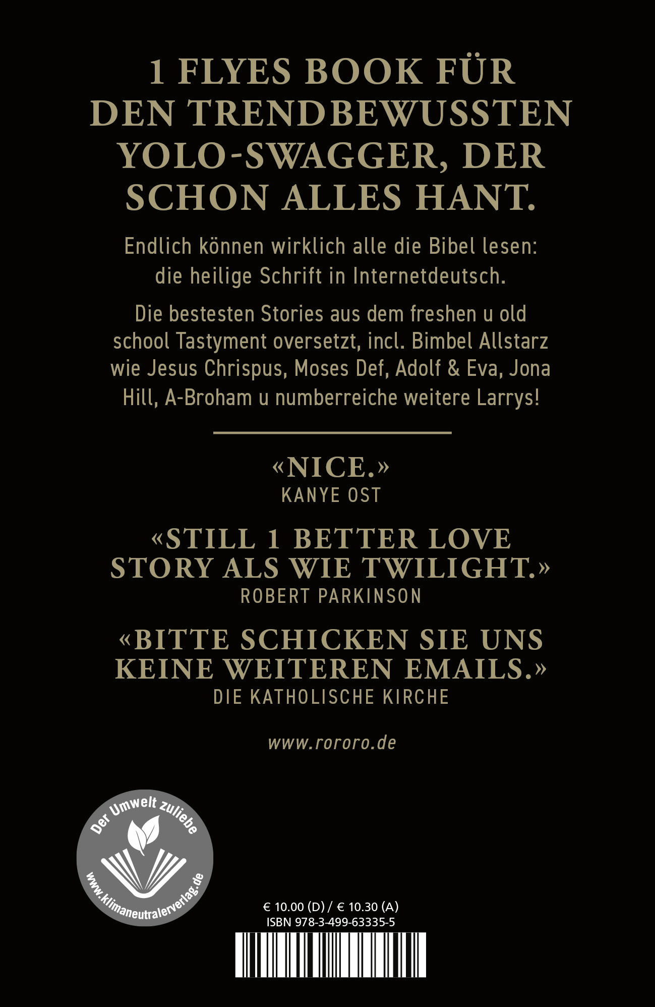 | Schlagworte | Berlin • Bibel • Bibel 2.0 • Bibel; Humor • Bibel Parodie • Bibel Satire • Heilig • Heiliges Land • Humor • Internet • Internetsprache • Israel • Jesus • Jugend • Jugendsprache • Memesprache • Meme-Sprech • Millenials • Palästina • Parodie • Religion • Religionskritik • religiöser Humor • satirebuch • Schwarzer Humor • Sprache • Stand-Up-Comedian • swag • Testament • Vong-Sprache |