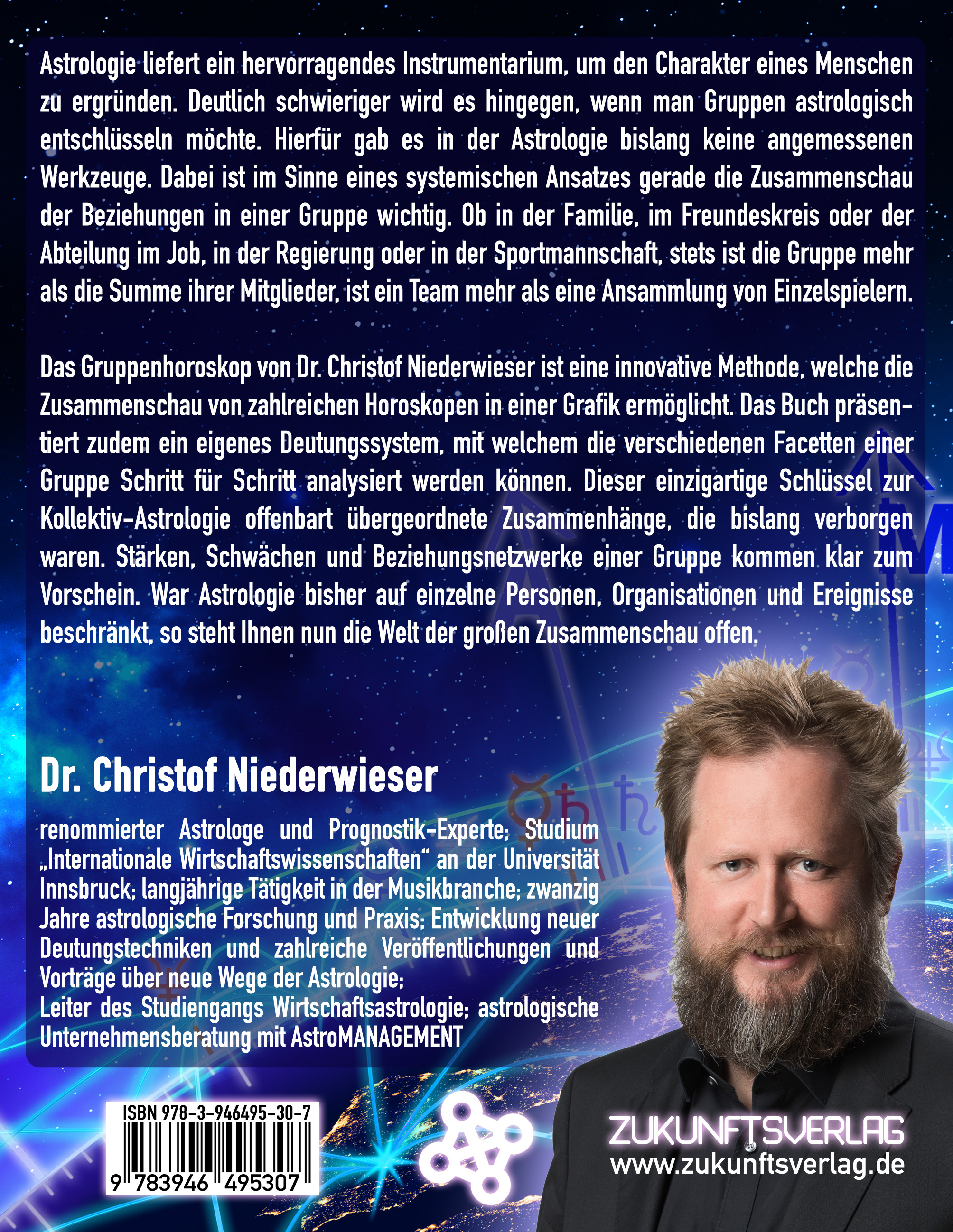 Das Gruppenhoroskop von Dr. Christof Niederwieser ist eine innovative Methode, welche die Zusammenschau von zahlreichen Horoskopen in einer Grafik ermöglicht. Das Buch präsentiert zudem ein eigenes Deutungssystem, mit welchem die verschiedenen Facetten einer Gruppe Schritt für Schritt analysiert werden können. Dieser einzigartige Schlüssel zur Kollektiv-Astrologie offenbart übergeordnete Zusammenhänge, die bislang verborgen waren. Stärken, Schwächen und Beziehungsnetzwerke einer Gruppe kommen klar zum Vorschein. War Astrologie bisher auf einzelne Personen, Organisationen und Ereignisse beschränkt, so steht Ihnen nun die Welt der großen Zusammenschau offen.