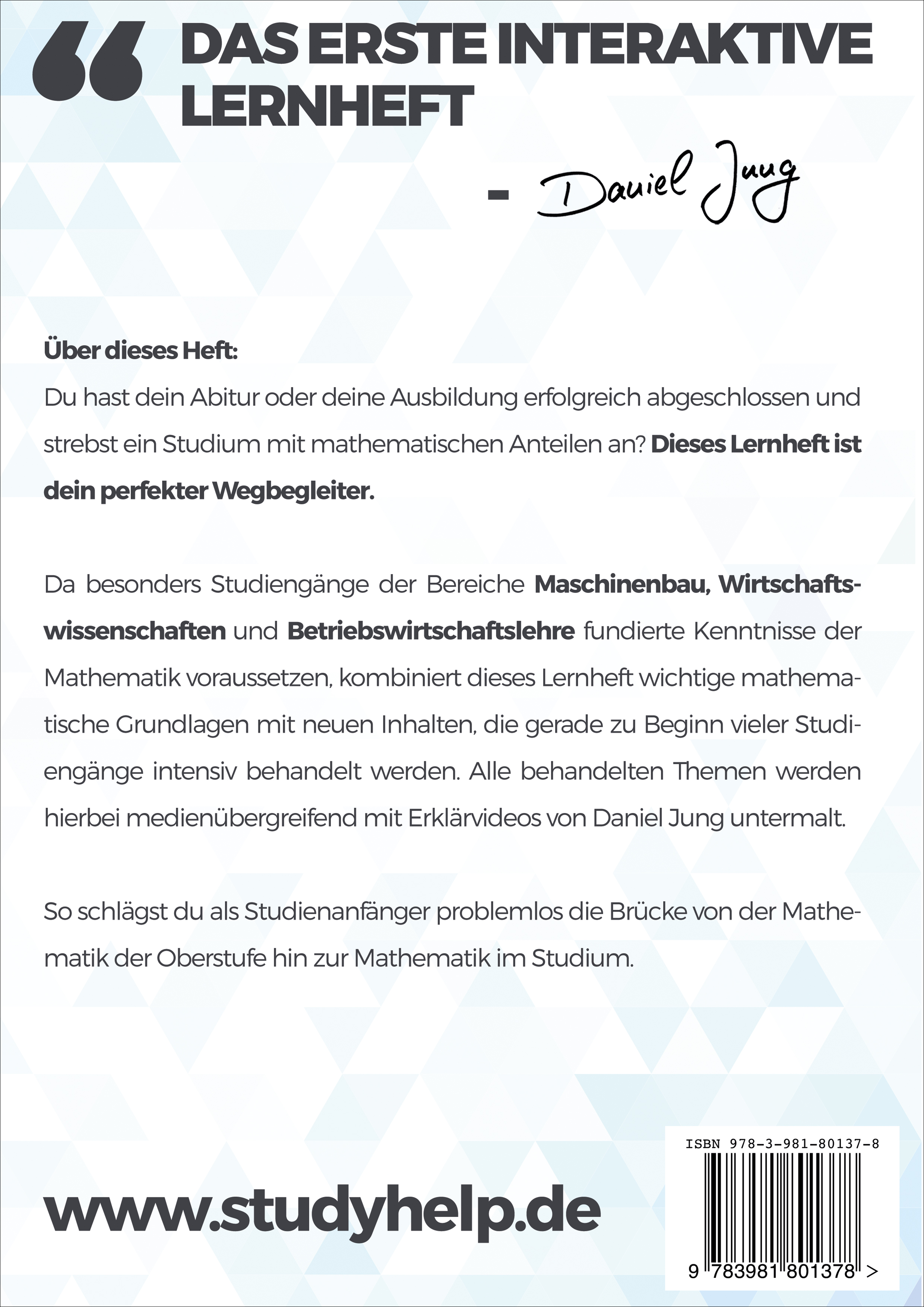 „Mathematische Grundlagen“ von Daniel Jung und StudyHelp ist das erste Lernheft seiner Art. Dank zahlreicher QR Codes im Heft stehen dir in Echtzeit über 2000 Erklärvideos als ergänzendes Lernmaterial zur Verfügung. Scanne hierzu mit deinem Smartphone einen QR Code und sieh dir ein auf dein Kapitel zugeschnittenes Video von Daniel Jung auf YouTube an.