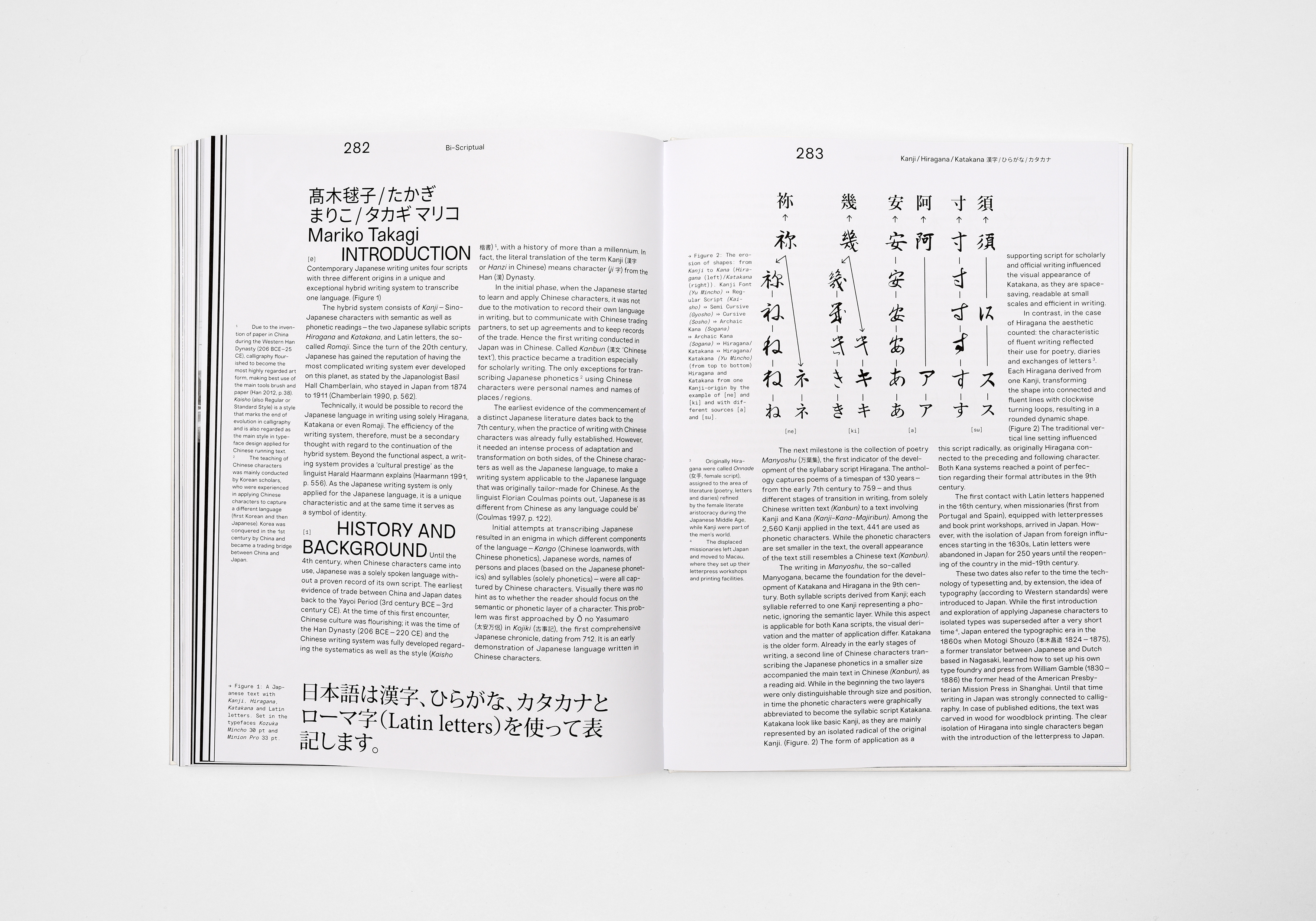 _Bedeutung und Notwendigkeit multilingualer Typografie_Theoretische Hintergründe_Praxis der bilingualen Gestaltung_Anwendungsbeispiele von über 100 DesignernDurch Globalisierung und länder- und kulturübergreifende Interaktion gewinnt der Multilingualismus weltweit an Bedeutung. Hierbei übernimmt die Schrift als der wichtigste Träger von Kommunikation eine herausragende Rolle. Designer müssen sich immer häufiger der Herausforderung stellen, nicht nur unterschiedliche Sprachen, sondern zwei oder sogar mehrere Schriftsysteme miteinander zu gestalten.Bi-Scriptual behandelt eingangs auf eher theoretischer Ebene Fragestellungen wie die soziokulturellen Beziehungen unterschiedlicher Schriftsysteme zueinander und die steigende Bedeutung soziokultureller Kommunikation. Nach einem generellen Abschnitt über die Praxis der bi-lingualen Gestaltung werden von Experten in den jeweiligen Sprachen acht Schriftsysteme in Beziehung zur lateinischen Schrift gesetzt. Dieser Teil enthält zudem Interviews zum Thema und Arbeitsbeispiele von über 100 Designern, die die verschiedenen Möglichkeiten aufzeigen, wie mit mehreren Schriftsystemen nebeneinander gestaltet werden kann.