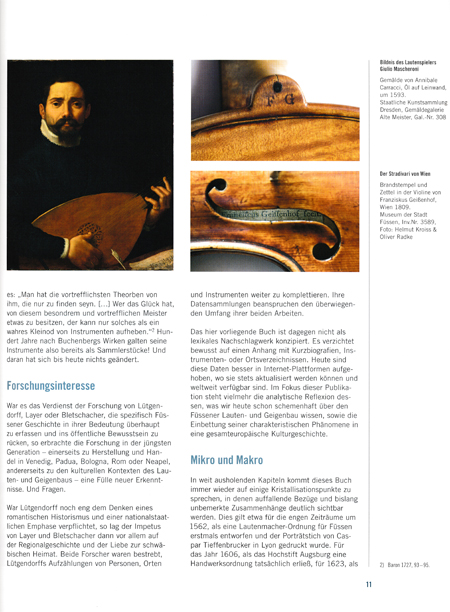 Drei fachkundige und versierte Autoren beschreiben aufschlussreich das Arbeitsleben von Füssener Lauten- und Geigenmachern, die sich in Handelsmetropolen und Residenzstädten südlich und nördlich der Alpen etabilierten. Dabei entsteht ein faszinierendes Bild europäischer Kultur- und Musikgeschichte vom 15. bis ins 19. Jahrhundert.