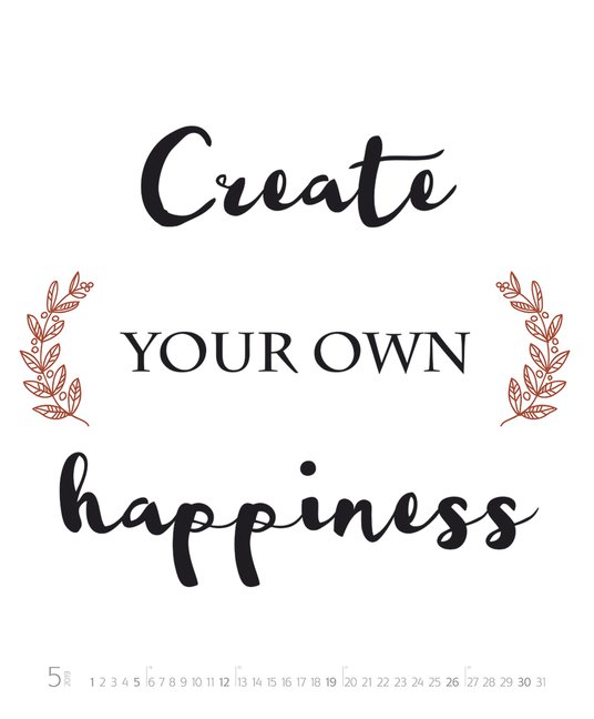 Elegant geschwungene Schriften im Stil des Handletterings sind einer der Trends, die man nicht mehr übersehen kann. Ihre Faszinationskraft liegt in der Individualität und Sorgfalt begründet, mit der jeder einzelne Buchstabe kalligrafisch zu einem kleinen Kunstwerk ausgestaltet wird. Die Bildsprache bleibt dezent und minimalistisch - nur wenige Buchstaben tanzen über den hellen Hintergrund des Bildes, um in diesem Kalender Monat für Monat die Schönheit und Sinnhaftigkeit eines poesievollen Spruches oder trendigen Lebensgefühls hervorzuheben.Für den gewissen Glamourfaktor sorgen edle Goldelemente, die jedes Bild zu einem besonderen Schmuckstück werden lassen und dem Kalender einen glanzvollen Auftritt im Raum garantieren.