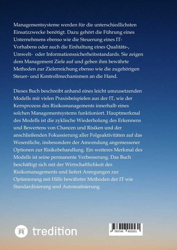 | Schlagworte | Informationssicherheit • Informationssicherheitsmanagement • IT • IT-Betrieb • IT-Risiken • Managementmodell • Managementsystem • Qualitätsmanagement • Risiko • Risikoanalyse • Risikomanagement • Softwareentwicklung • Umweltmanagement |