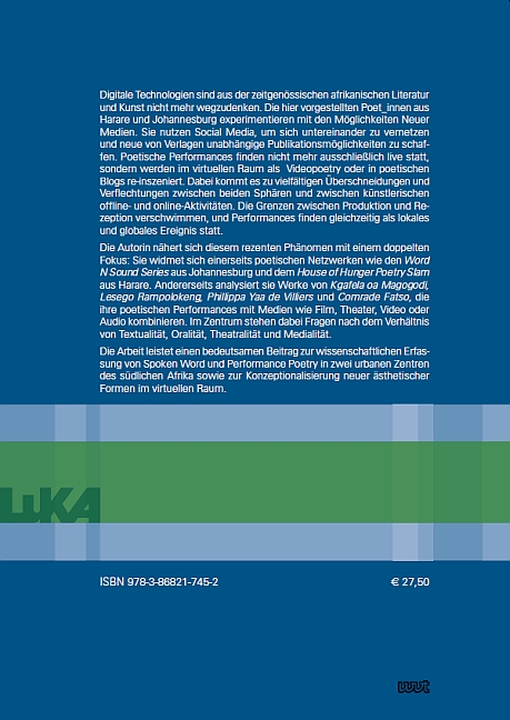 Die Arbeit leistet einen bedeutsamen Beitrag zur wissenschaftlichen Erfassung von Spoken Word und Performance Poetry in zwei urbanen Zentren des südlichen Afrika sowie zur Konzeptionalisierung neuer ästhetischer Formen im virtuellen Raum.