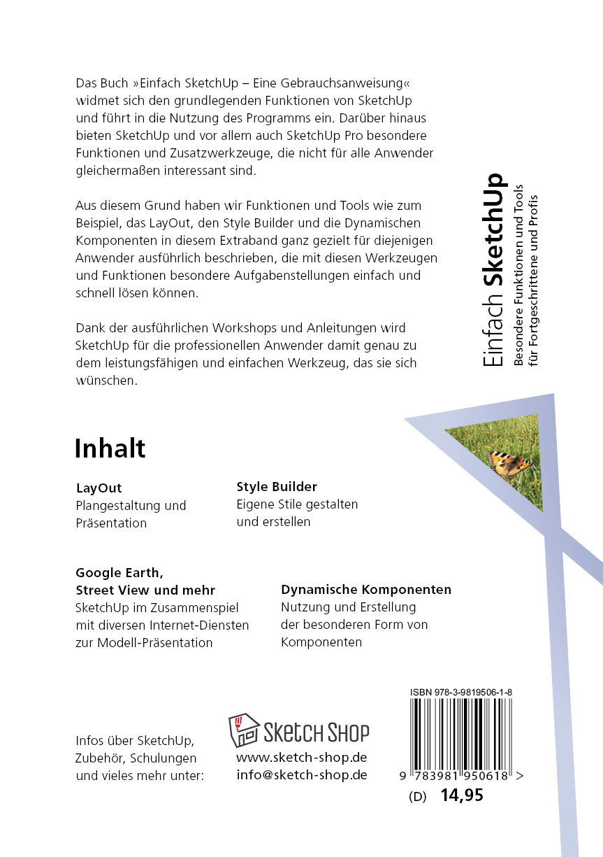 Nicht alle Funktionen von SketchUp bzw. SketchUp Pro sind für alle Anwender gleichermaßen interessant und wichtig. Dies bezieht sich nicht auf den Unterschied zwischen einem professionellen und privaten Einsatz von SketchUp. Vielmehr ist es zum Beispiel für einen Inneneinrichter nicht interessant, sein Modell nach Google Earth hochzuladen und zu veröffentlichen - im Bereich der Architektur sieht das aber ganz anders aus. Aus diesem Grund haben wir besondere Funktionen und Tools in diesem Extraband ganz gezielt für diejenigen Anwender beschrieben, denen sich in Ihrem Arbeitsalltag genau die Fragen stellen, die mit diesen Werkzeugen einfach und schnell zu lösen sind. Für die professionellen Anwender wird SketchUp damit genau zu dem leistungsfähigen und einfachen Werkzeug, das sie sich wünschen. Einige der in diesem Buch angesprochenen Themen sind in den Beschreibungen und Workshops unseres Grundlagenbuchs "Einfach Sketch - Eine Gebrauchsanweisung" bereits kurz beschrieben. An den entsprechenden Stellen finden sich immer Hinweise auf dieses Buch. Mit der Übernahme von SketchUp durch die Firma Trimble hat sich die Entwicklung des Programms dynamisiert. Die regelmäßigen Updates bringen auf der einen Seite neue Funktionen und Verbesserungen, auf der anderen Seite hat das Ausscheiden der Firma Google vor allem im Bereich 3D-Galerie, Google Earth und Street View deutliche Auswirkungen. Diese Veränderungen haben uns dazu veranlasst dieses Buch noch einmal zu aktualisieren und an die neuen Versionen von SketchUp anzupassen.