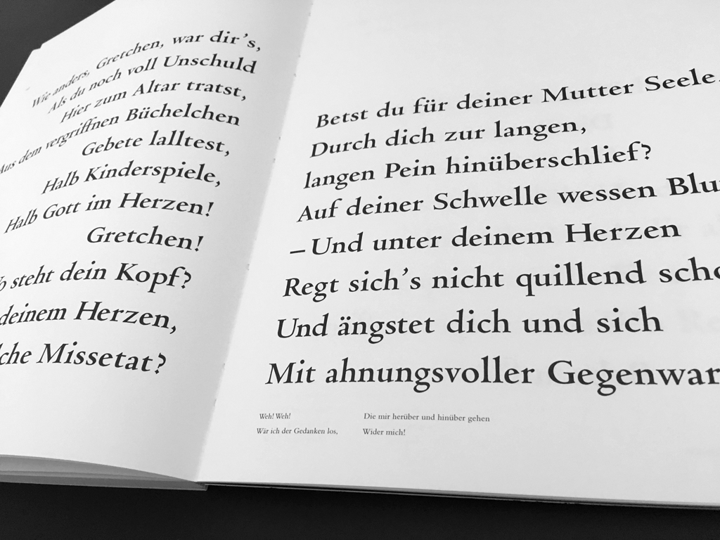 Das Buchprojekt »Die Gretchenfrage« inszeniert das Werk, »Faust I« von Johann Wolfgang von Goethe typografisch. Den Personen im Stück wird eine ihrem Charakter entsprechende Schriftart zugewiesen. Im Verlauf der Handlung wird deren Stimmung durch den Einsatz typografischer Auszeichnungen von Wort, Zeile bis hin zum Absatz dargestellt. Somit wird die Dramatik des Werkes visuell erlebbar.