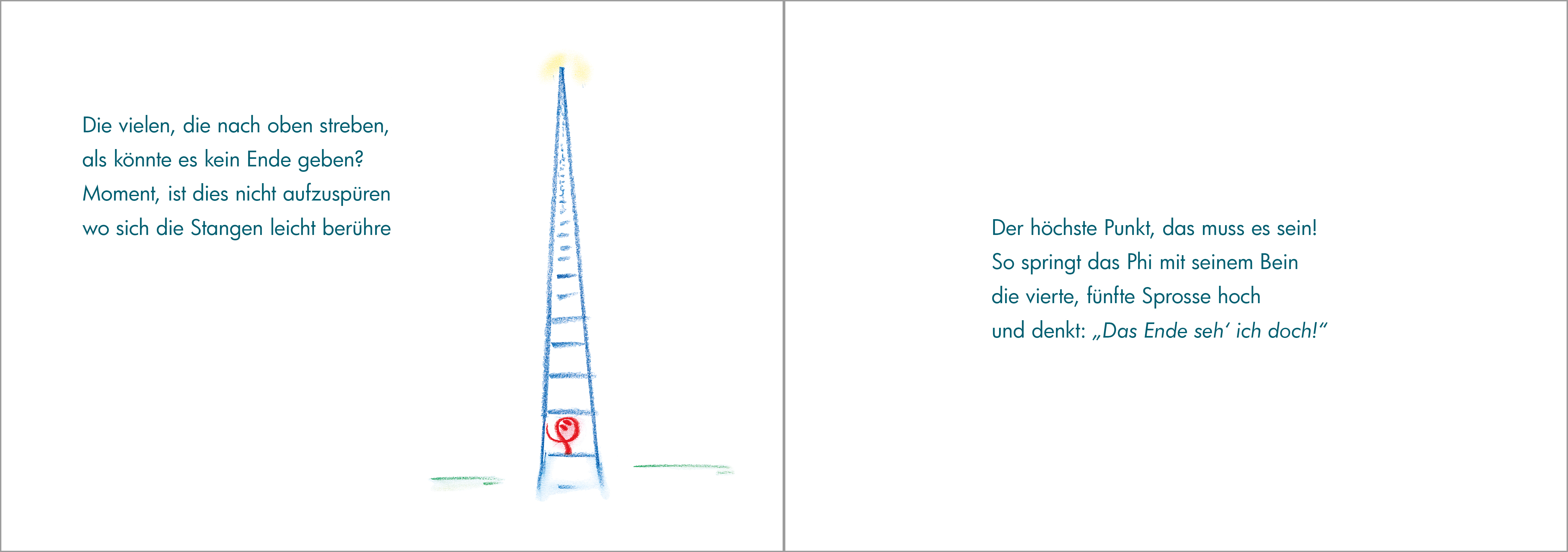 Gibt es eine größte Zahl? Wie kann ich mir unendlich viele Zahlen vorstellen? Diese Fragen greift das mathematische Bilderbuch auf. Dabei nimmt ein kleines Phi die Leser mit auf eine Reise ins Land der Zahlen. Das kleine Phi findet eine Zahlenleiter und merkt, dass Zahlen groß oder klein erscheinen können, je nachdem, von welchem Blickwinkel aus sie betrachtet werden. Um die größte Zahl zu erreichen, steigt das kleine Phi die Zahlenleiter immer weiter hinauf. Was es jedoch entdeckt, ist anders als es dachte.