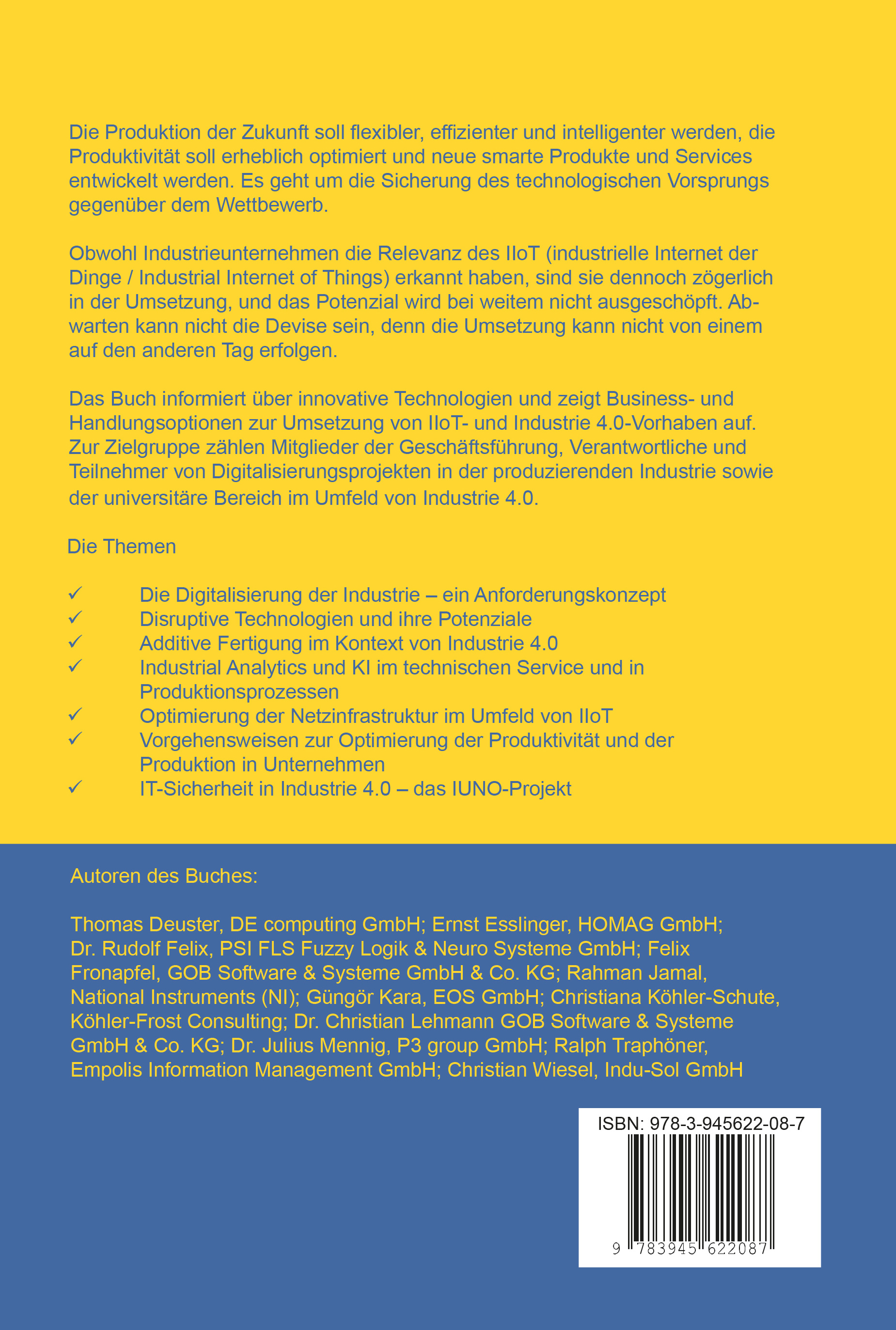 Das Buch informiert über innovative Technologien und zeigt Business- und Handlungsoptionen zur Umsetzung von IIoT- und Industrie 4.0-Vorhaben auf. Zur Zielgruppe zählen Mitglieder der Geschäftsführung, Verantwortliche und Teilnehmer von Digitalisierungsprojekten in der produzierenden Industrie sowie der universitäre Bereich im Umfeld von Industrie 4.0.
