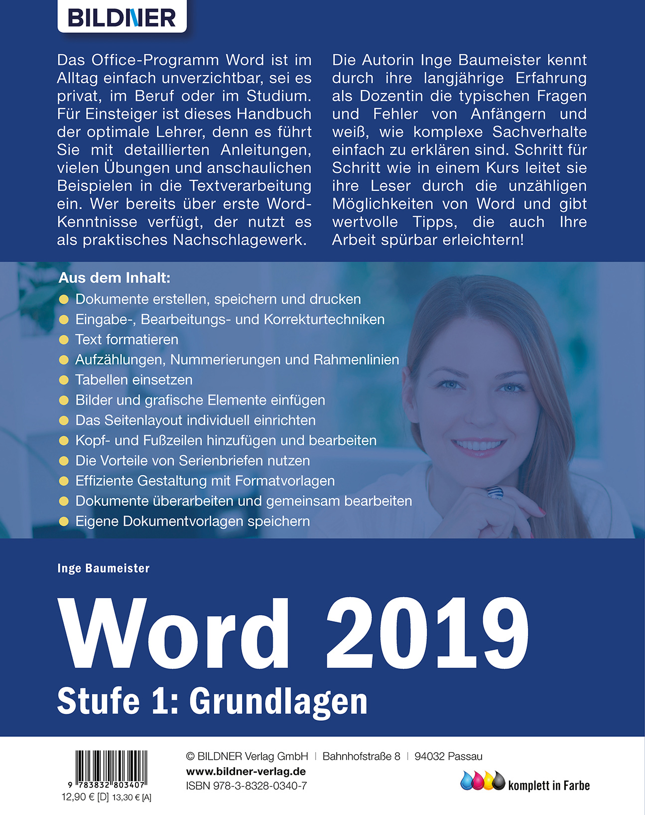 Die Autorin Inge Baumeister kennt durch ihre langjährige Erfahrung als Dozentin die typischen Fragen und Fehler von Anfängern und weiß, wie komplexe Sachverhalte einfach zu erklären sind. Schritt für Schritt wie in einem Kurs leitet sie ihre Leser durch die unzähligen Möglichkeiten von Word und gibt wertvolle Tipps, die auch Ihre Arbeit spürbar erleichtern!