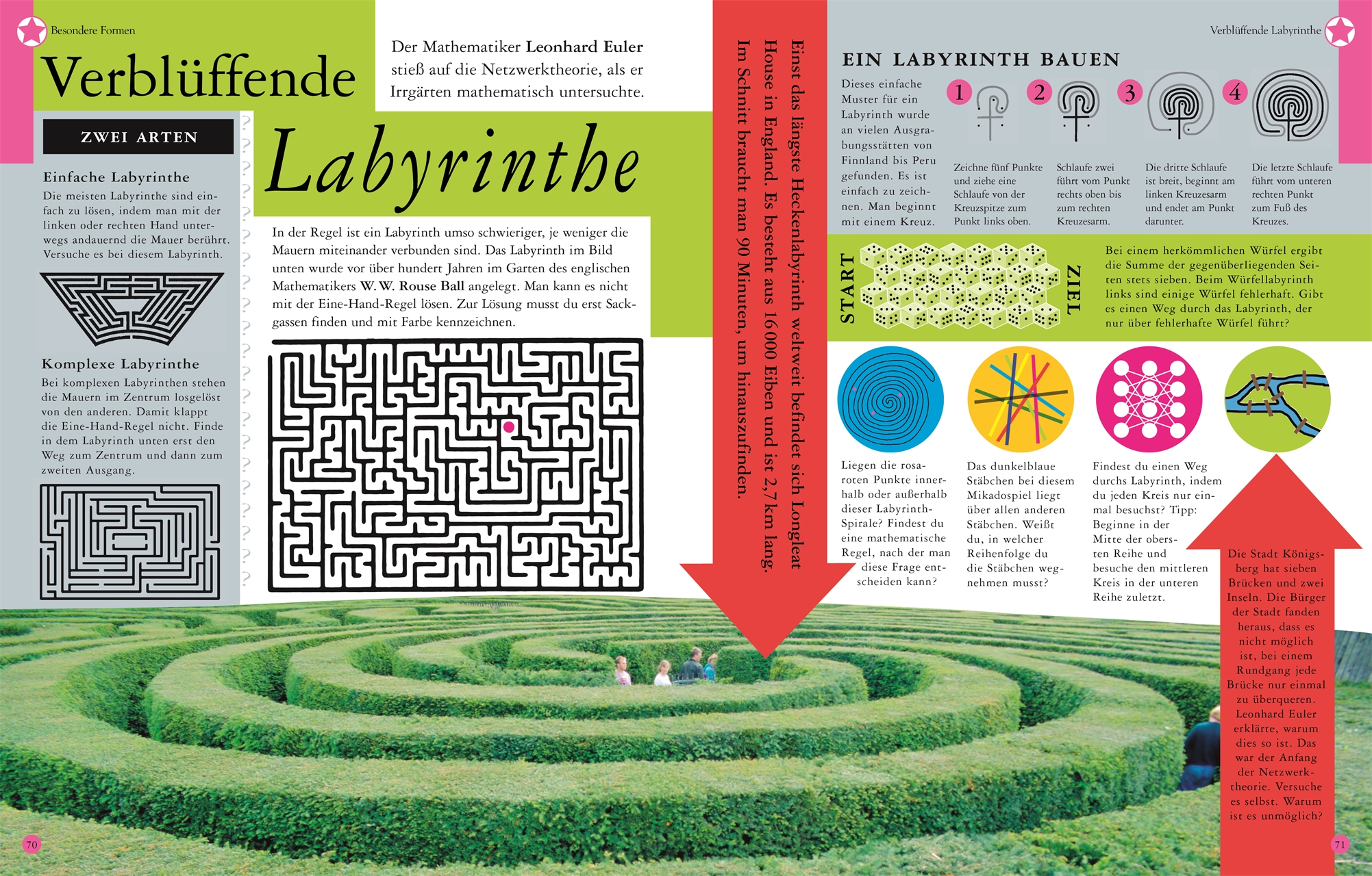 Spannendes Zusatzwissen Mathematik: Drei Kapitel gehen verschiedenen Zahlenphänomenen, geometrischen Formen und fachübergreifenden Theorien wie der Wahrscheinlichkeits- oder Chaostheorie auf den Grund. Hier erfahren Kinder z.B., warum manche Blumen ausgerechnet 34 oder 55 oder 89 Blütenblätter haben.
