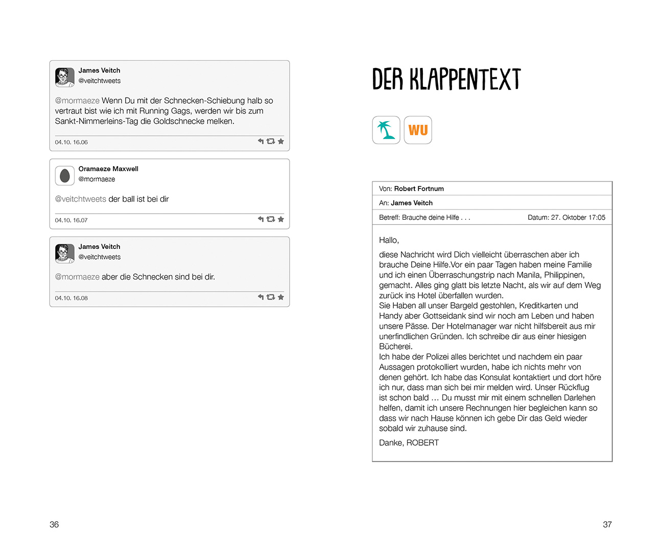 Wir alle kennen sie, die Anfragen Unbekannter, die uns zunächst kennenlernen wollen, weil wir so nett sind. Meist löschen wir solche E-Mails, sofern sie der Spam-Filter nicht schon im Vorfeld abgewehrt hat. James Veitch fasst sich ein Herz, nimmt Kontakt auf, entlarvt die wahren Ansinnen und macht daraus ganz große »Digital Comedy«. Wir kennen sie, die flehenden, charmant-unbeholfenen Kontaktaufnahmen per E-Mail schöner Waisenmädchen aus östlichen Ländern, die ein treues Männerherz in westlichen Ländern zu berühren suchen. Oder jene der Witwen aus südlichen Ländern, die dringend unsere Unterstützung bei der Abwicklung ihres Millionenerbes brauchen.