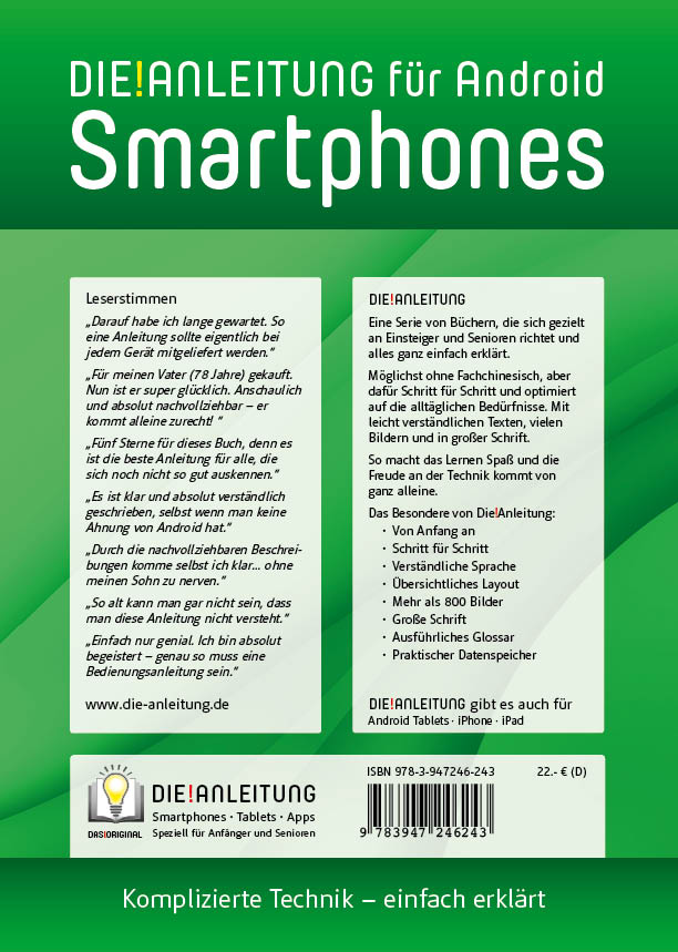 DIE ANLEITUNG erklärt Ihnen anschaulich und Schritt für Schritt die Grundlagen für den Gebrauch im Alltag. Mit vielen Bilder, in gut lesbarer Schrift und möglichst wenig Fachchinesisch. So macht das Lernen Spaß und die Freude an der Technik kommt von ganz alleine. Mit dieser Anleitung entdecken Sie selbstständig und sicher alle Funktionen Ihres Smartphones - ganz ohne Ärger, Frust und Enttäuschungen. DIE ANLEITUNG hilft Ihnen dabei - versprochen.