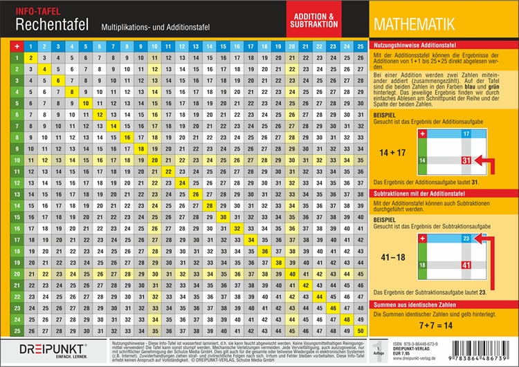 Sie möchten schnell herausfinden, wie viel 23x15 ist? 19x16? Oder 14x25? Selbst mit dem Smartphone oder dem Taschenrechner müssen alle Zahlen erst eingetippt werden, um das Ergebnis zu erhalten. Auf dieser praktischen Rechentafel befinden sich Multiplikations- und Additionstabellen für die Addition und Subtraktion sowie für die Multiplikation und Division der Zahlen von 1 bis 25. Alle Ergebnisse auf einen Blick - schnell und übersichtlich, mit leicht verständlicher Anleitung. Geeignet für Schüler, Studenten und Freunde der Mathematik. Durch die wasserfeste Laminierung ist die Info-Tafel robust und unzerreißbar!