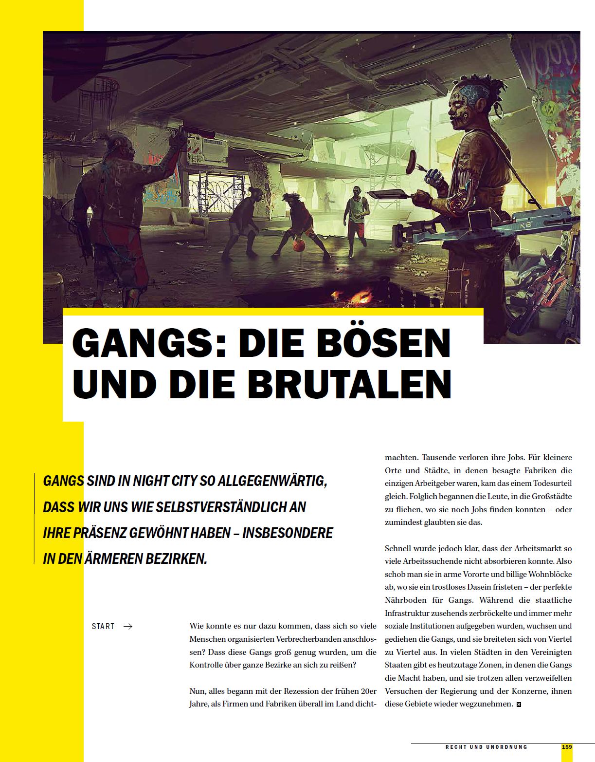 EINLEITUNG WIR LEBEN IN EINER DYSTOPISCHEN WELT, MEINE FREUNDE, VOLLER VERBRECHEN, KORRUPTION UND ARMUT, BEHERRSCHT VON GROSSEN, MACHTHUNGRIGEN KONZERNEN UND HERZLOSEN, BRUTALEN REGIERUNGEN. Jedes Jahr stehen wir vor einer neuen globalen Krise, jeden Tag müssen wir uns mit den Folgen der letzten herumschlagen. Die von den Konzernen gekauften Massenmedien – wie N54 oder WNS – füttern die Massen mit einem inhaltslosen Brei aus leicht verdaulichen, nichtssagenden Nachrichten, Gehirnwäsche und Werbung und fördern so den beliebten Trend von »Mehr kaufen, weniger denken«. [...] Was wir in unserer Welt brauchen, sind freie Medien. Es gibt Dutzende Indie-Sender und Infoseiten – sie zu finden, ist der erste Schritt zu unabhängigem Denken Wir sind so eine Seite. Wir sind der Night City Inquirer. Du wirst keine Werbung für uns in der Innenstadt finden, und doch sind wir hier, eine niemals ruhende Präsenz im Net. Wir sind keine naiven Rebellen, die den großen Konzernen ihren Einfluss streitig machen wollen. Wir bringen dir einfach nur Nachrichten und Geschichten aus der realen Welt. [...]