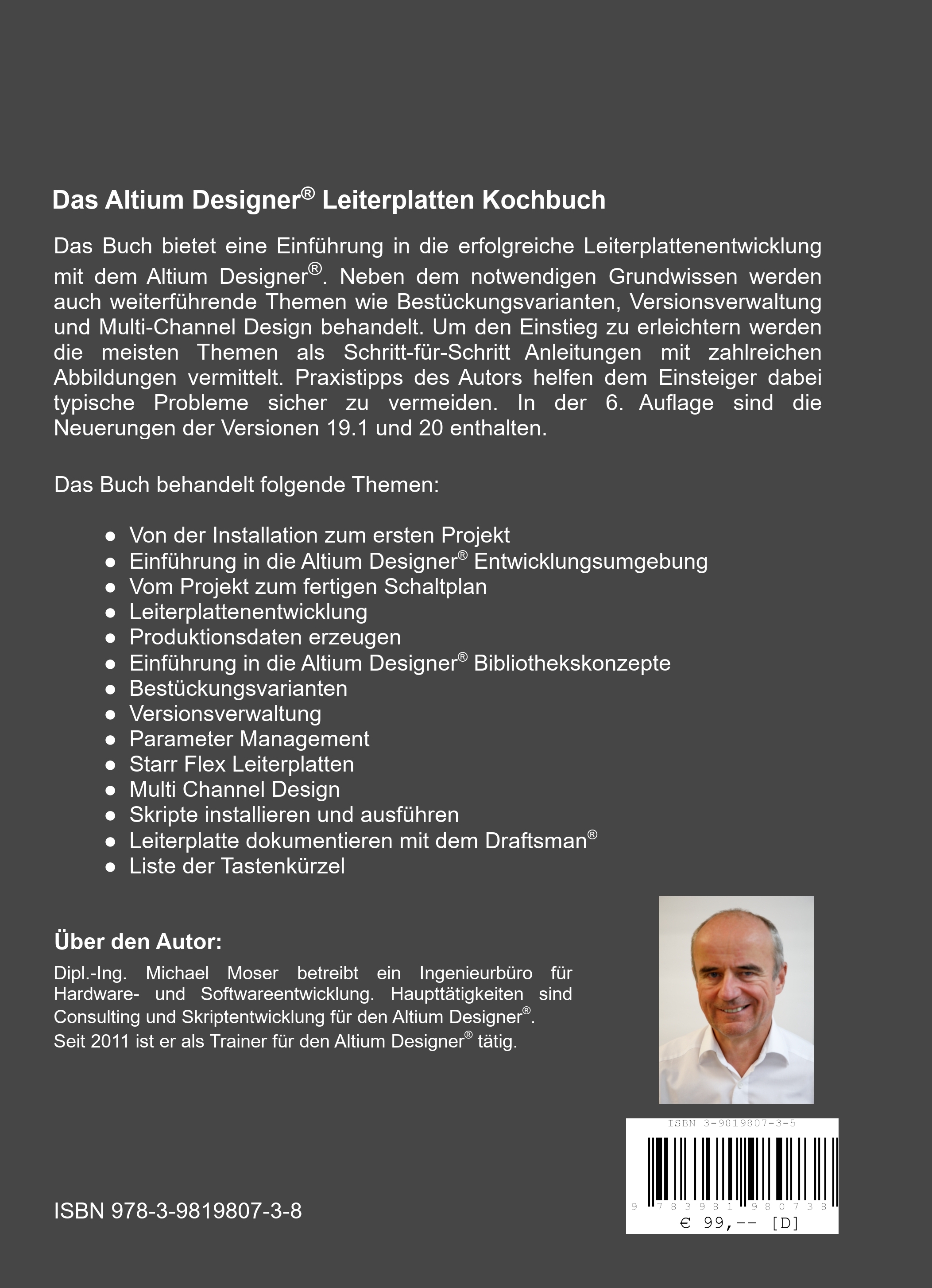 Das Buch bietet eine Einführung in die erfolgreiche Leiterplattenentwicklung mit dem Altium Designer. Neben dem notwendigen Grundwissen werden auch weiterführende Themen wie Bestückungsvarianten, Versionsverwaltung und Multi-Channel Design behandelt. Um den Einstieg zu erleichtern werden die meisten Themen als Schritt-für-Schritt Anleitungen mit zahlreichen Abbildungen behandelt. Praxistipps des Autors helfen dem Einsteiger dabei typische Probleme sicher zu vermeiden. Die 6. Auflage enthält alle Neuerungen der Version 20.0