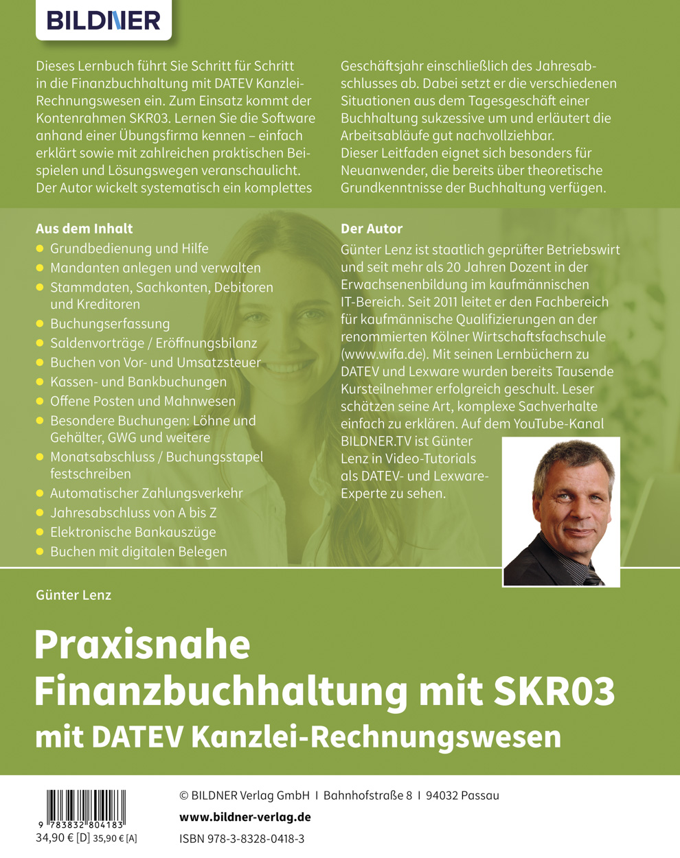 Dieses Lernbuch führt Sie Schritt für Schritt in die Finanzbuchhaltung mit DATEV Kanzlei-Rechnungswesen ein. Zum Einsatz kommt der Kontenrahmen SKR03. Lernen Sie die Software* anhand einer Übungsfirma kennen - einfach erklärt sowie mit zahlreichen praktischen Beispielen und Lösungswegen veranschaulicht. Der Autor wickelt systematisch ein komplettes Geschäftsjahr einschließlich des Jahresabschlusses ab. Dabei setzt er die verschiedenen Situationen aus dem Tagesgeschäft einer Buchhaltung sukzessive um und erläutert die Arbeitsabläufe gut nachvollziehbar.