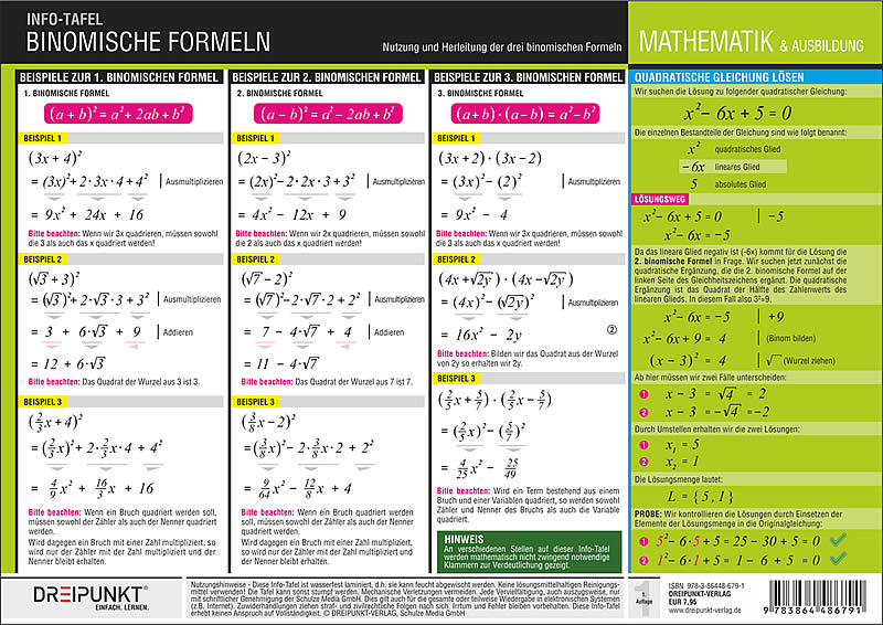 | Schlagworte | Berechnung • binomische Formel • Binomische Formeln • Dreipunkt • Dreipunkt-Verlag • Dreisatz • Gleichung • Hilfe • Hilfsmittel • Info Tafel • Info-Tafel • Mathe • Mathe für Anfänger • Mathe für Einsteiger • Mathe-Grundlagen • Mathematik • mathematisch • Nachhilfe • Praktisch • Quadratische Gleichung • Rechenregeln • Rechnen • Schüler • Student • Verstehen |