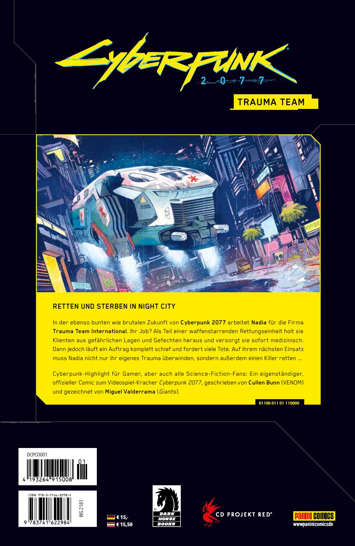In der ebenso bunten wie brutalen Zukunft von Cyberpunk 2077 arbeitet Nadia für die Firma Trauma Team International. Ihr Job? Als Teil einer waffenstarrenden Rettungseinheit holt sie Klienten aus gefährlichen Lagen und Gefechten heraus und versorgt sie sofort medizinisch. Dann jedoch läuft ein Auftrag komplett schief und fordert viele Tote. Auf ihrem nächsten Einsatz muss Nadia nicht nur ihr eigenes Trauma überwinden, sondern außerdem einen Killer retten ...