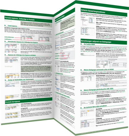 lt;p>Diese Wo&Wie Schnellübersicht "Microsoft Excel - Formeln und Funktionen kompakt für alle Versionen" behandelt die wichtigsten Themen, die Sie in Microsoft Excel benötigen. Die Faltkarte beinhaltet u. a. Anleitungen zu diesen Bereichen: Grundlegendes zum Rechnen mit Excel; Formel eingeben; Summe berechnen; Formeln kopieren; Zellbezüge in Formeln; Anpassen von Zellbezügen beim Kopieren; Bezüge auf Tabellenblätter oder Arbeitsmappen; Formeln korrigieren; Aufbau und Eingabe von Funktionen; einfache Auswertungsfunktionen; Berechnungen aufgrund von Bedingungen; Werte in Tabellen nachschlagen; Werte runden; Wichtige Datumsfunktionen; Textfunktionen; Fehlersuche und -behandlung; Namen verwenden.