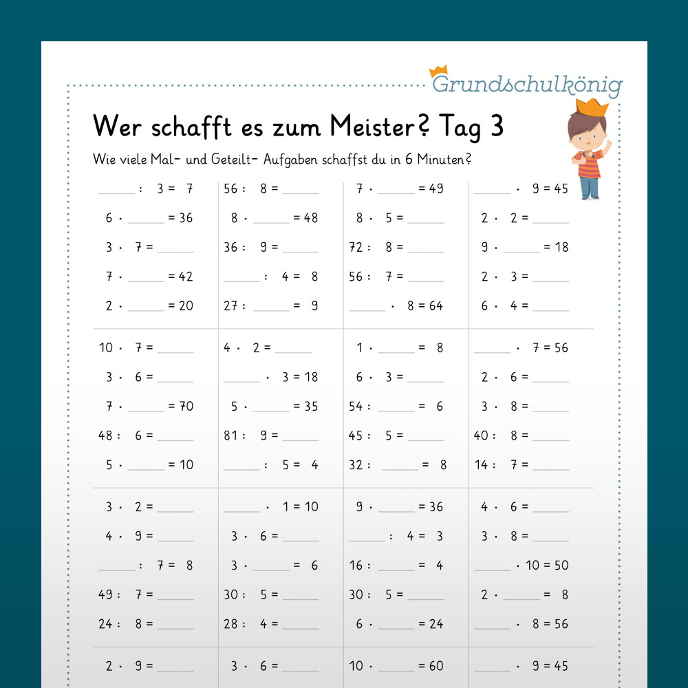 Sieben Tage lang ist an jedem Tag ein Arbeitsblatt mit je 76 Aufgaben zum 1×1 zu lösen. Die Kinder haben jeweils sechs Minuten Zeit, die Aufgaben zu bearbeiten. Wer je Arbeitsblatt mindestens 47 Aufgaben in der vorgegebenen Zeit richtig gelöst hat, ist auf dem besten Weg zum „Einmaleins-Meister“ und kann das nächste Blatt in Angriff nehmen.