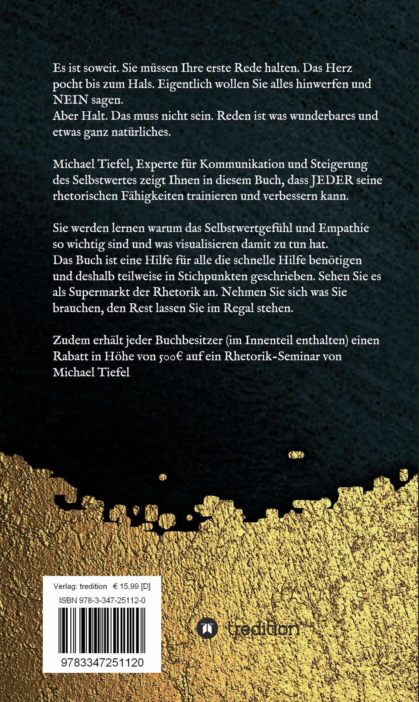 Es ist soweit. Sie müssen Ihre erste Rede halten. Das Herz pocht bis zum Hals. Eigentlich wollen Sie alles hinwerfen und NEIN sagen. Aber Halt. Das muss nicht sein. Reden ist was wunderbares und etwas ganz natürliches. Michael Tiefel, Experte für Kommunikation und Steigerung des Selbstwertes zeigt Ihnen in diesem Buch, dass JEDER seine rhetorischen Fähigkeiten trainieren und verbessern kann. Sie werden lernen warum das Selbstwertgefühl und Empathie so wichtig sind und was visualisieren damit zu tun hat. Das Buch ist eine Hilfe für alle die schnelle Hilfe benötigen und deshalb teilweise in Stichpunkten geschrieben. Sehen Sie es als Supermarkt der Rhetorik an. Nehmen Sie sich was Sie brauchen, den Rest lassen Sie im Regal stehen. Zudem erhält jeder Buchbesitzer (im Innenteil enthalten) einen Rabatt in Höhe von 500EUR auf ein Rhetorik-Seminar von Michael Tiefel