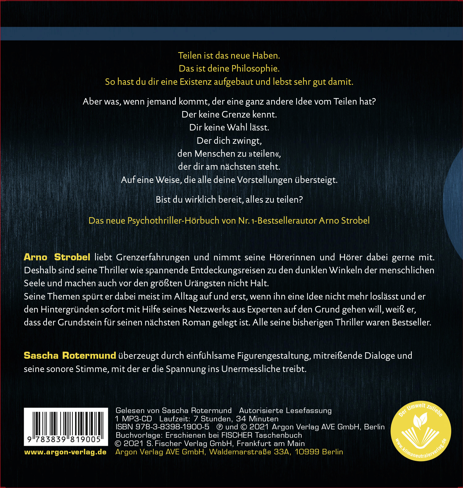 | Schlagworte | Andreas Winkelmann • Arno Strobel Hörbuch 2021 • Arno Strobel Neuerscheinung 2021 • bücher bestseller • Carsharing • Darknet Thriller • Die App • Digitalisierung • Entführung • Entführung Spiel • Entführung Thriller • Erpressung • Kidnapping • Konsum • Krimi Bestseller • Nachhaltigkeit • Offline • Online Sicherheit • Psychothriller • Rache • Sebastian Fitzek • Sharing • Sharing Kultur • Sharing-Unternehmen • Social Media • Soziale Medien • Teilen • Thriller • Thriller Neuerscheinungen 2022 • Torture • Verzicht • Weihnachten Krimi |