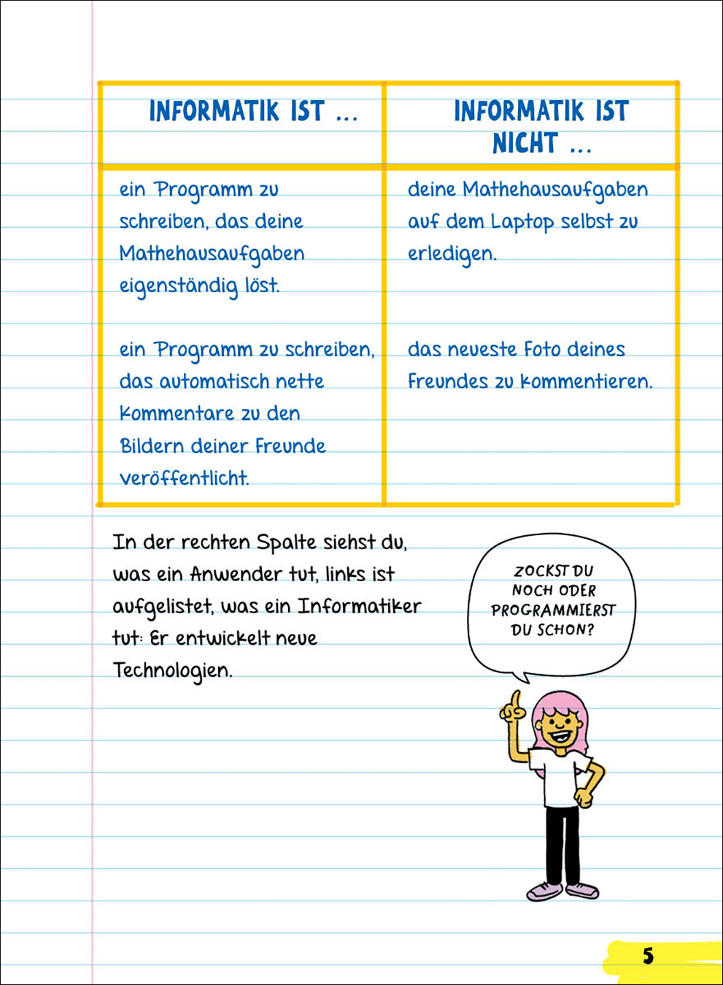 Umfassendes Nachschlagewerk und Übungsbuch in Informatik und Programmieren für Schüler*innen bis hin zu Studierenden. Optimal geeignet zur Vertiefung und Auffrischung oder zum Einstieg ins Programmieren und zur Vorbereitung auf Tests. Die außergewöhnliche Gestaltung mit Scribbles und Cartoons sowie witzige Kommentare sorgen für Auflockerung. Nach jedem Kapitel folgt ein Wissensquiz, Multiple-Choice-Test oder ein Lückentext zur Lernkontrolle.