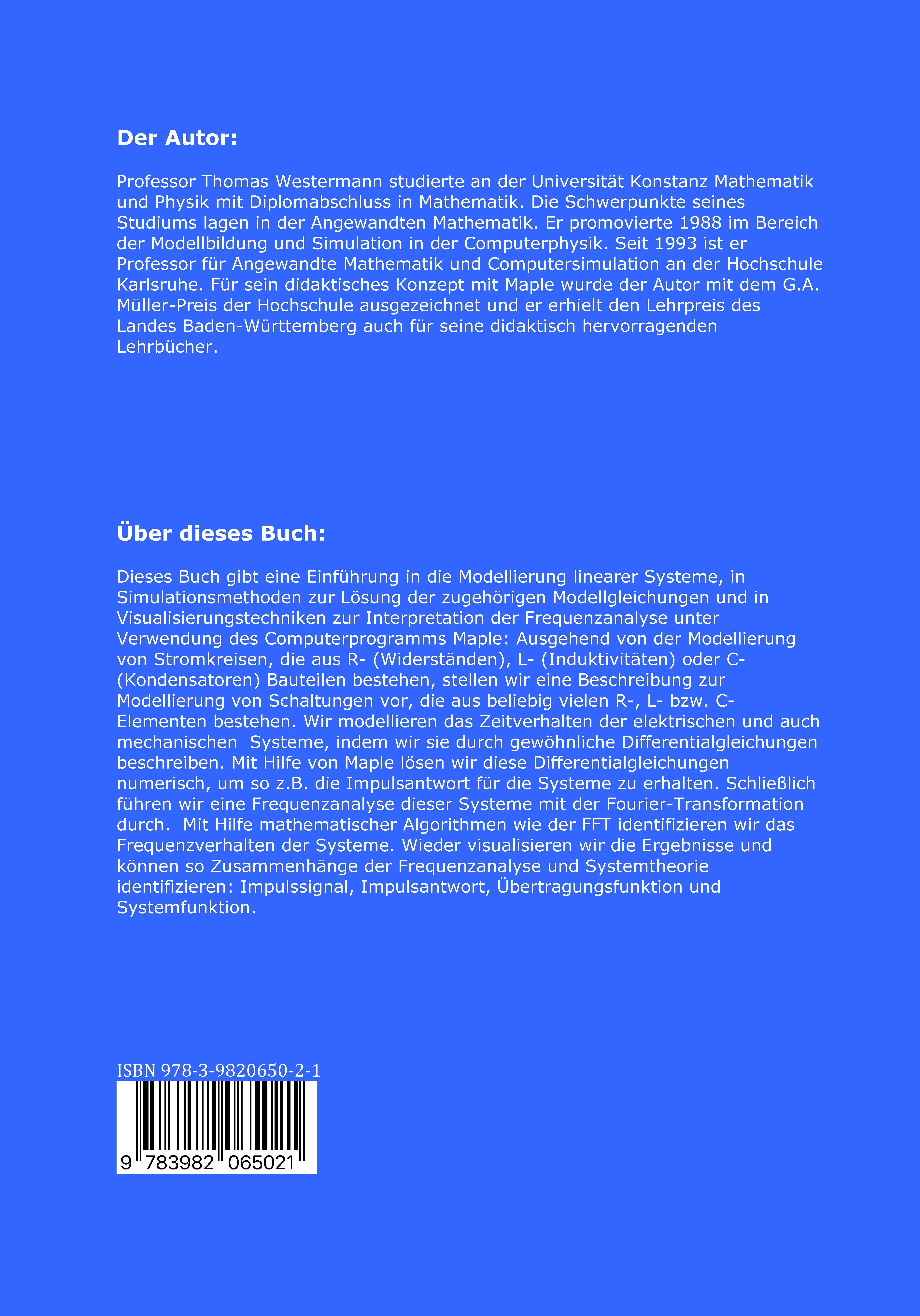 Dieses Buch gibt eine Einführung in die Modellierung linearer Systeme, in Simulationsmethoden zur Lösung der zugehörigen Modellgleichungen und in Visualisierungstechniken zur Interpretation der Frequenzanalyse unter Verwendung des Computerprogramms Maple: Ausgehend von der Modellierung von Stromkreisen, die aus R- (Widerständen), L- (Induktivitäten) oder C- (Kondensatoren) Bauteilen bestehen, stellen wir eine Beschreibung zur Modellierung von Schaltungen vor, die aus beliebig vielen R-, L- bzw. C- Elementen bestehen. Wir modellieren das Zeitverhalten der elektrischen und auch mechanischen Systeme, indem wir sie durch gewöhnliche Differentialgleichungen beschreiben. Mit Hilfe von Maple lösen wir diese Differentialgleichungen numerisch, um so z.B. die Impulsantwort für die Systeme zu erhalten. Schließlich führen wir eine Frequenzanalyse dieser Systeme mit der Fourier-Transformation durch. Mit Hilfe mathematischer Algorithmen wie der FFT identifizieren wir das Frequenzverhalten der Systeme. Wieder visualisieren wir die Ergebnisse und können so Zusammenhänge der Frequenzanalyse und Systemtheorie identifizieren: Impulssignal, Impulsantwort, Übertragungsfunktion und Systemfunktion.