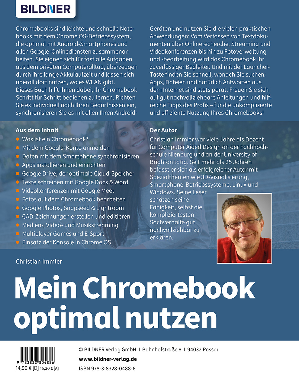 Dieses Buch hilft Ihnen dabei, Ihr Chromebook Schritt für Schritt bedienen zu lernen. Richten Sie es individuell nach Ihren Bedürfnissen ein, synchronisieren Sie es mit allen Ihren Android-Geräten und nutzen Sie die vielen praktischen Anwendungen: Vom Verfassen von Textdokumenten über Onlinerecherche, Streaming und Videokonferenzen bis hin zu Fotoverwaltung und -bearbeitung wird das Chromebook Ihr zuverlässiger Begleiter. Und mit der Launcher-Taste finden Sie schnell, wonach Sie suchen: Apps, Dateien und natürlich Antworten aus dem Internet sind stets parat. Freuen Sie sich auf gut nachvollziehbare Anleitungen und hilfreiche Tipps des Profis - für die unkomplizierte und effiziente Nutzung Ihres Chromebooks!