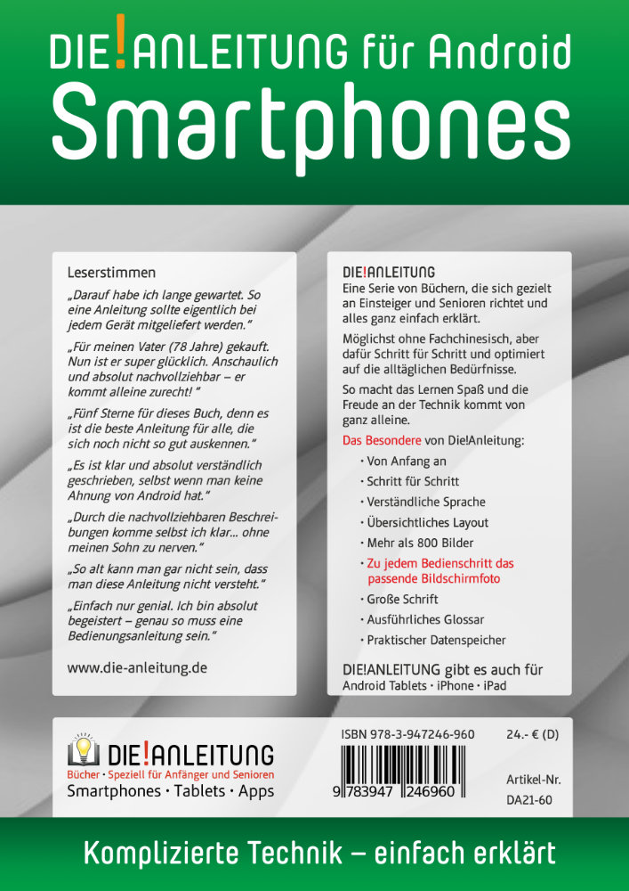 DIE ANLEITUNG erklärt Ihnen anschaulich und Schritt für Schritt die Grundlagen für den Gebrauch im Alltag. Mit vielen Bilder, in gut lesbarer Schrift und möglichst wenig Fachchinesisch. So macht das Lernen Spaß und die Freude an der Technik kommt von ganz alleine. Mit dieser Anleitung entdecken Sie selbstständig und sicher alle Funktionen Ihres Smartphones - ganz ohne Ärger, Frust und Enttäuschungen. DIE ANLEITUNG hilft Ihnen dabei - versprochen.