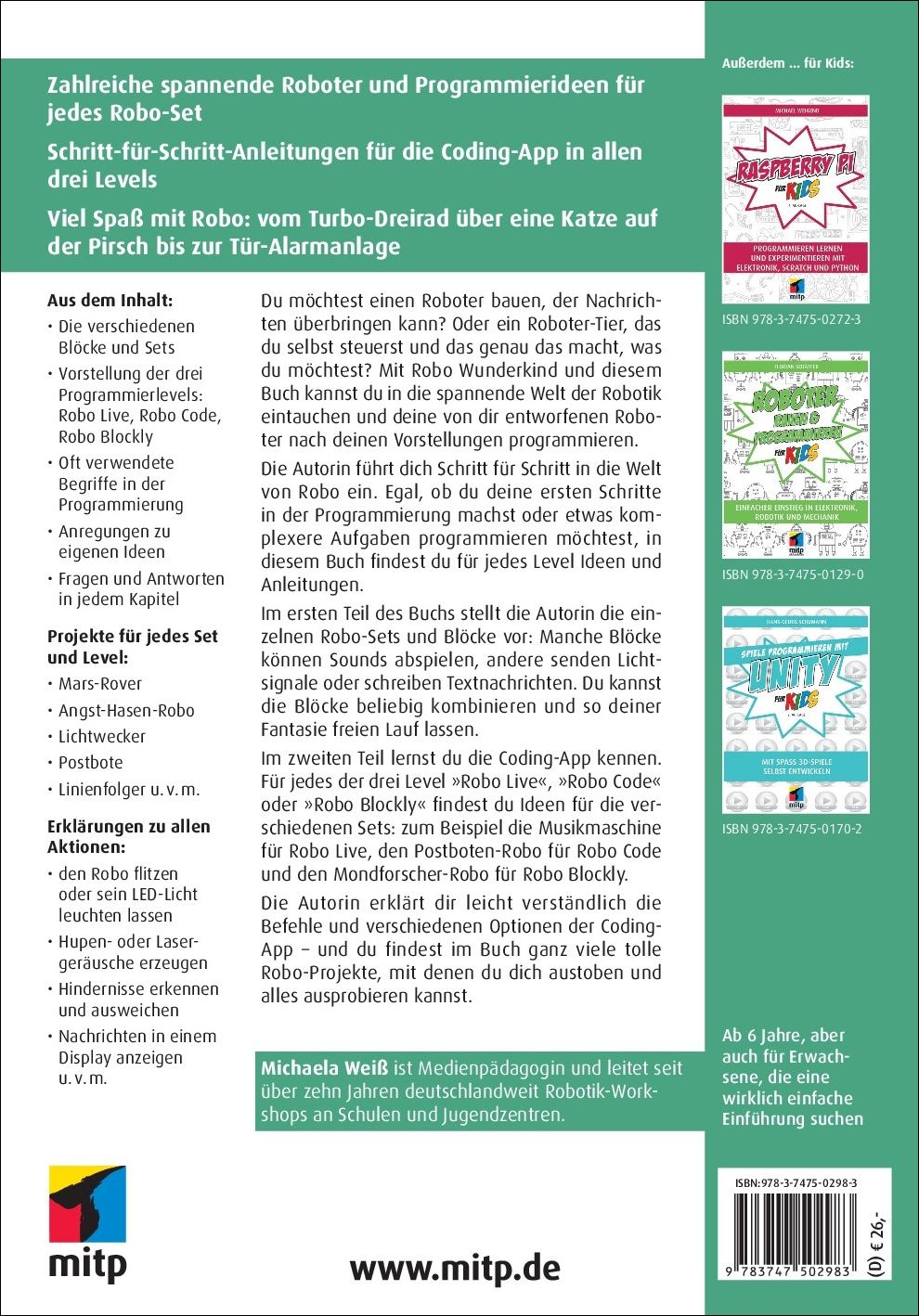 Die Autorin erklärt dir leicht verständlich die Befehle und verschiedenen Optionen der Coding-App – und du findest im Buch ganz viele tolle Robo-Projekte, mit denen du dich austoben und alles ausprobieren kannst.