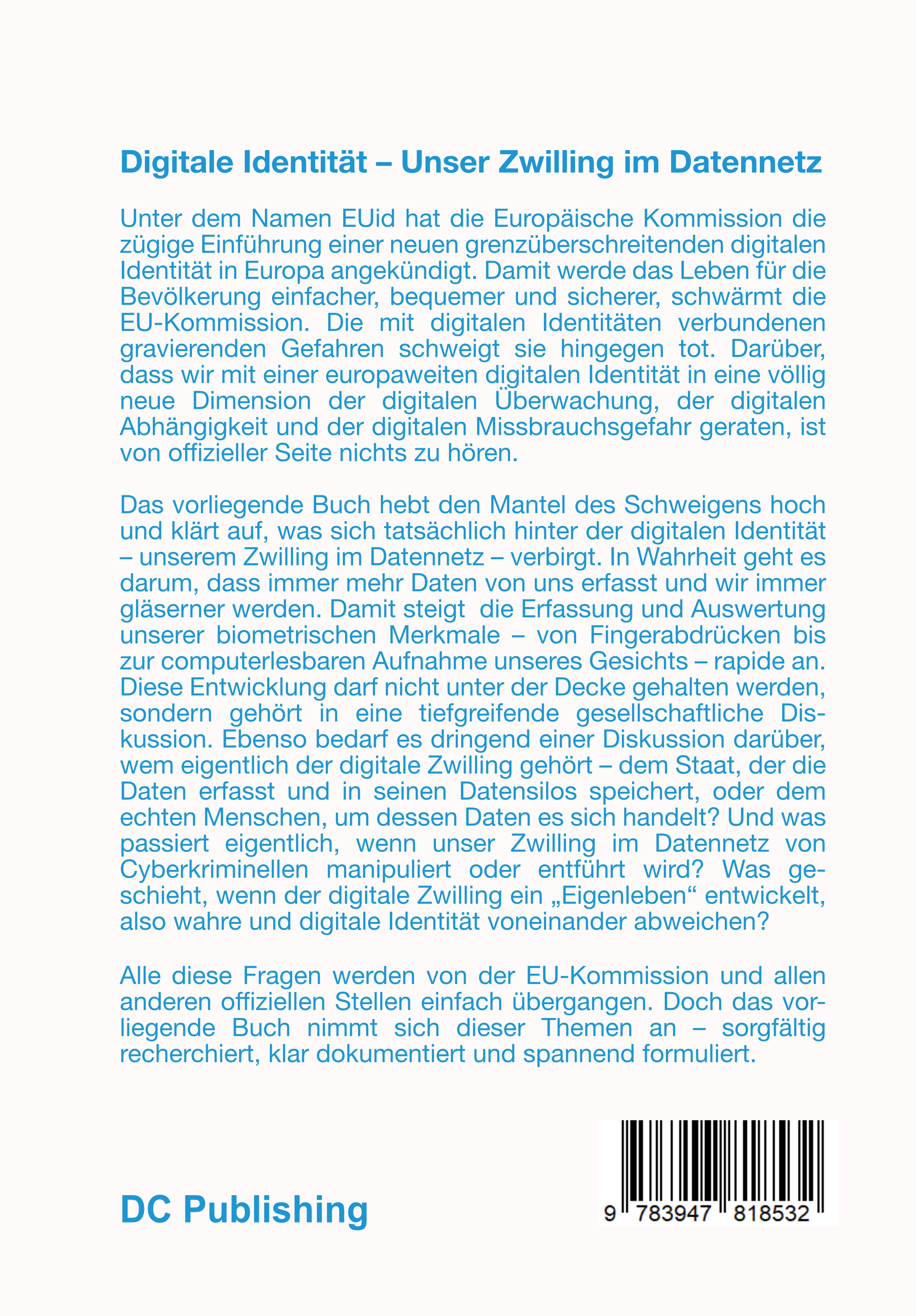 Das vorliegende Buch hebt den Mantel des Schweigens hoch und klärt auf, was sich tatsächlich hinter der digitalen Identität – unserem Zwilling im Computer – verbirgt. Tatsächlich geht es darum, dass immer mehr Daten von uns erfasst und wir immer gläserner werden. In Wahrheit steigt damit die Erfassung und Auswertung unserer biometrischen Merkmale – von Fingerabdrücken bis zur computerlesbaren Aufnahme unseres Gesichts – rapide an. Diese Entwicklung darf nicht unter der Decke gehalten werden, sondern gehört in eine tiefgreifende gesellschaftliche Diskussion.