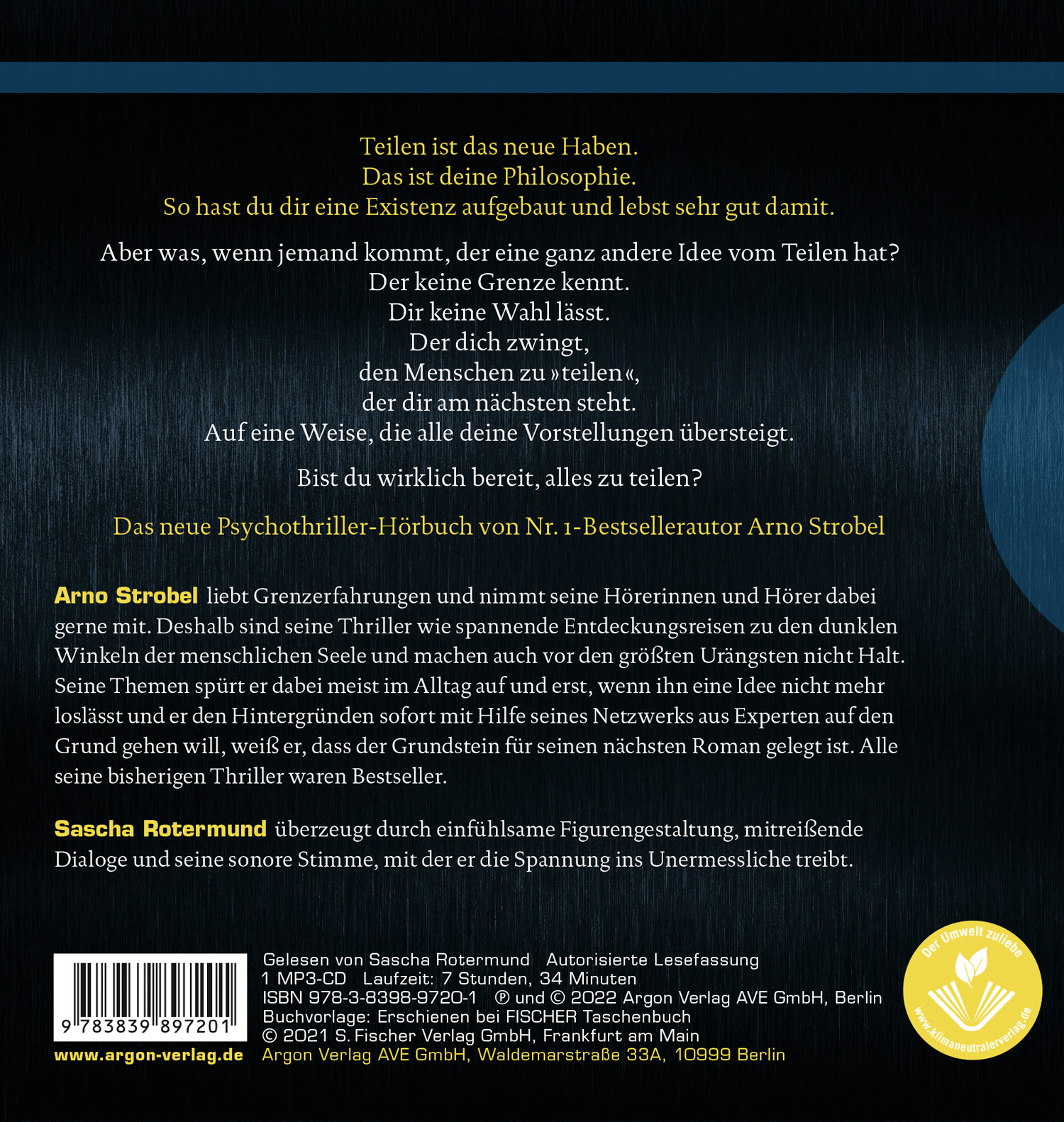 Sascha Rotermund, die deutsche Stimme von u. a. Benedict Cumberbatch und Jon Hamm, weiß genau, wie man die Thriller von Arno Strobel zu Adrenalin-Hörbüchern macht. Mit ihm wird Sharing zum Pflichtstück für hartgesottene Hörer.