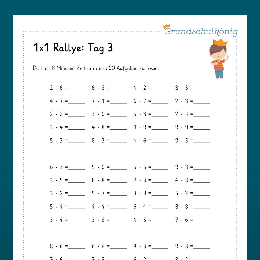 Sieben Tage lang gibt es jeden Tag Aufgaben zum 1×1! Ihr habt jeweils acht Minuten Zeit, die Aufgaben zu lösen. Wenn Ihr weniger als fünf Fehler auf Eurem Arbeitsblatt habt, geht es am nächsten Tag mit dem folgenden Blatt weiter. Bei fünf und mehr Fehlern übt Ihr einfach am nächsten Tag noch einmal das gleiche Blatt. Wenn Ihr alle sieben Blätter erfolgreich gelöst habt, seid Ihr echte „1×1-Profis“!