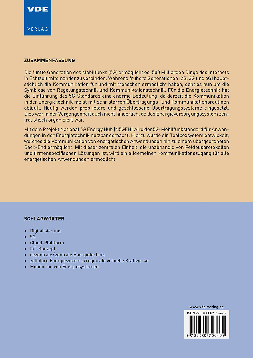 Die fünfte Generation des Mobilfunks (5G) ermöglicht es, 500 Milliarden Dinge des Internets in Echtzeit miteinander zu verbinden. Während frühere Generationen (2G, 3G und 4G) hauptsächlich die Kommunikation für und mit Menschen ermöglicht haben, geht es nun um die Symbiose von Regelungstechnik und Kommunikationstechnik. Für die Energietechnik hat die Einführung des 5G-Standards eine enorme Bedeutung, da derzeit die Kommunikation in der Energietechnik meist mit sehr starren Übertragungs- und Kommunikationsroutinen abläuft. Häufig werden proprietäre und geschlossene Übertragungssysteme eingesetzt. Dies war in der Vergangenheit auch nicht hinderlich, da das Energieversorgungssystem zentralistisch organisiert war.Mit dem Projekt National 5G Energy Hub (N5GEH) wird der 5G-Mobilfunkstandard für Anwendungen in der Energietechnik nutzbar gemacht. Hierzu wurde ein Toolboxsystem entwickelt, welches die Kommunikation von energetischen Anwendungen hin zu einem übergeordneten Back-End ermöglicht. Mit dieser zentralen Einheit, die unabhängig von Feldbusprotokollen und firmenspezifischen Lösungen ist, wird ein allgemeiner Kommunikationszugang für alle energetischen Anwendungen ermöglicht.