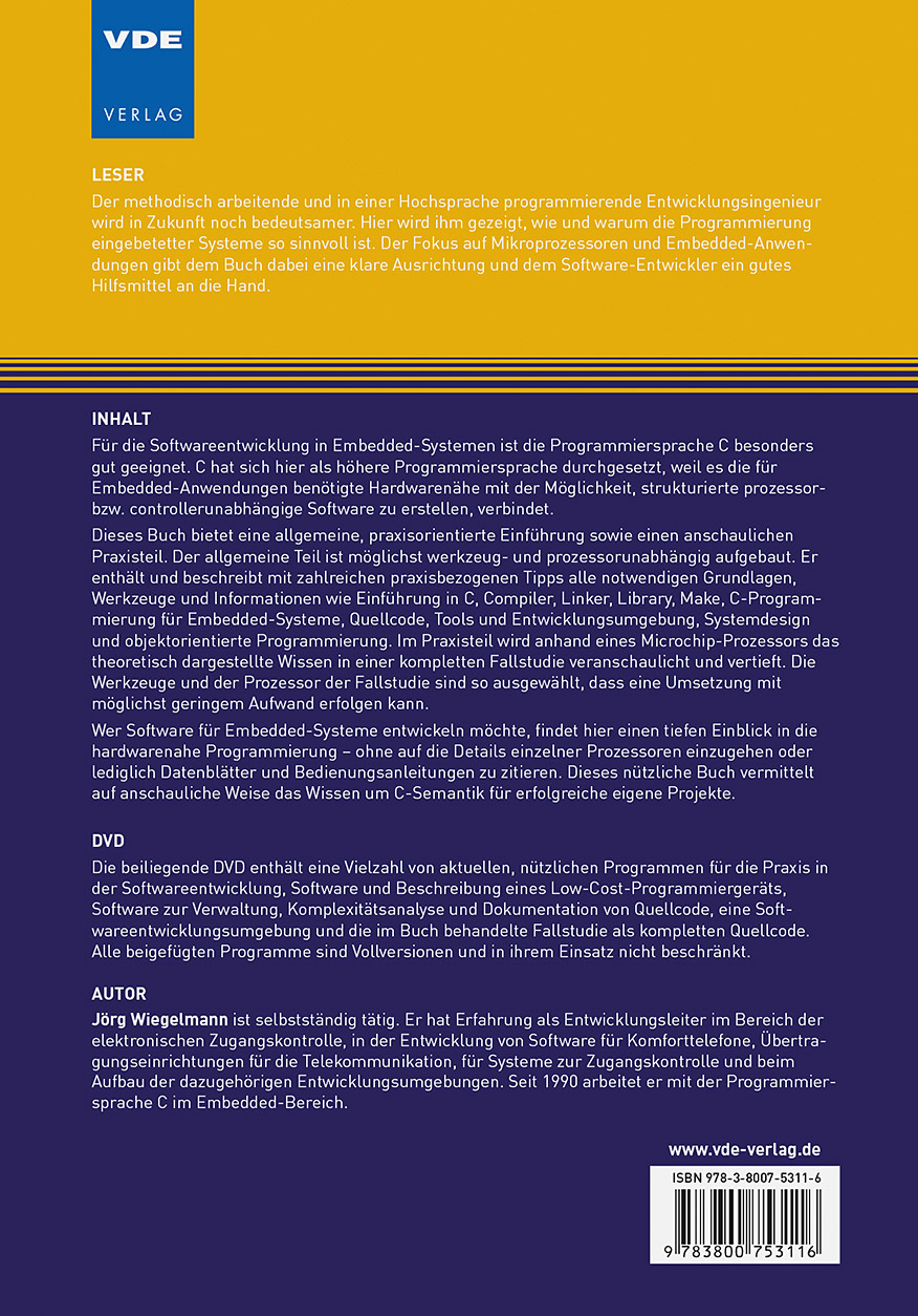 Für die Softwareentwicklung in Embedded-Systemen ist die Programmiersprache C besonders gut geeignet. C hat sich hier als höhere Programmiersprache durchgesetzt, weil es die für Embedded-Anwendungen benötigte Hardwarenähe mit der Möglichkeit, strukturierte prozessor- bzw. controllerunabhängige Software zu erstellen, verbindet.Dieses Buch bietet eine allgemeine, praxisorientierte Einführung sowie einen anschaulichen Praxisteil. Der allgemeine Teil ist möglichst werkzeug- und prozessorunabhängig aufgebaut. Er enthält und beschreibt mit zahlreichen praxisbezogenen Tipps alle notwendigen Grundlagen, Werkzeuge und Informationen wie Einführung in C, Compiler, Linker, Library, Make, C-Programmierung für Embedded-Systeme, Quellcode, Tools und Entwicklungsumgebung, Systemdesign und objektorientierte Programmierung. Im Praxisteil wird anhand eines Microchip-Prozessors das theoretisch dargestellte Wissen in einer kompletten Fallstudie veranschaulicht und vertieft. Die Werkzeuge und der Prozessor der Fallstudie sind so ausgewählt, dass eine Umsetzung mit möglichst geringem Aufwand erfolgen kann.Wer Software für Embedded-Systeme entwickeln möchte, findet hier einen tiefen Einblick in die hardwarenahe Programmierung - ohne auf die Details einzelner Prozessoren einzugehen oder lediglich Datenblätter und Bedienungsanleitungen zu zitieren. Dieses nützliche Buch vermittelt auf anschauliche Weise das Wissen um C-Semantik für erfolgreiche eigene Projekte.DVDDie beiliegende DVD enthält eine Vielzahl von aktuellen, nützlichen Programmen für die Praxis in der Softwareentwicklung, Software und Beschreibung eines Low-Cost-Programmiergeräts, Software zur Verwaltung, Komplexitätsanalyse und Dokumentation von Quellcode, eine Softwareentwicklungsumgebung und die im Buch behandelte Fallstudie als kompletten Quellcode. Alle beigefügten Programme sind Vollversionen und in ihrem Einsatz nicht beschränkt.