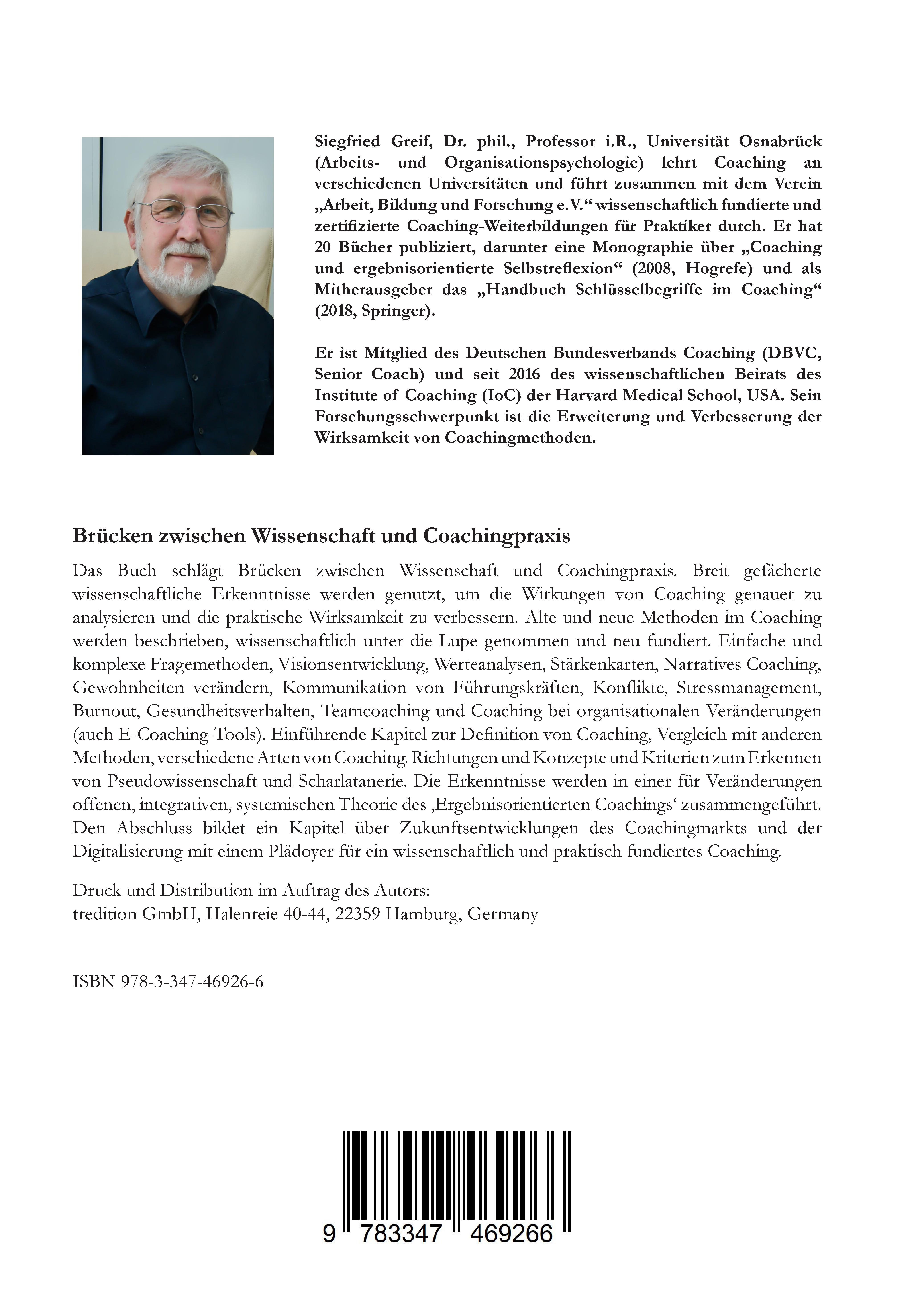 Siegfried Greif, Dr. phil., Professor i.R., Universität Osnabrück (Deutschland, Lehrstuhl für Arbeits- und Organisationspsychologie). Sein aktueller Arbeits- und Forschungsschwerpunkt ist die Erweiterung und Verbesserung der Wirksamkeit von Coachingmethoden. Er hat 20 Bücher publiziert, darunter eine Monographie über „Coaching und ergebnisorientierte Selbstreflexion“ (2008, Hogrefe) und als Mitherausgeber das „Handbuch Schlüsselbegriffe im Coaching“ (2018, Springer, erweiterte englische Auflage: „International Handbook of Evidence Based Coaching“, 2021). Er ist Autor vieler Artikel in Fachzeitschriften und diverser Buchkapitel. Er lehrt Coaching an verschiedenen Universitäten und führt zusammen mit dem Verein „Arbeit, Bildung und Forschung e.V.“ wissenschaftlich fundierte und zertifizierte Coaching-Weiterbildungen für Praktiker durch. Siegfried Greif ist Mitglied der Deutschen Gesellschaft für Psychologie und Stifter des Innovationspreises der Fachgruppe Arbeits-, Organisations- und Wirtschaftspsychologie sowie Mitglied des Deutschen Bundesverbands Coaching (DBVC, Senior Coach) und der International Society of Coaching Psychology (ISCP). Er war Research Fellow der britischen Psychological Society (1984), hatte den Wilhelm-Wundt Lehrstuhl der Universität Leipzig (1991/92) inne und ist seit 2016 Mitglied des wissenschaftlichen Beirats des Institute of Coaching (IoC) der Harvard Medical School, USA. Homepage Universität Osnabrück: https://www.home.uni-osnabrueck.de/sgreif/ Wissenschaftlich fundierte Coachings-Weiterbildung zum „Ergebnisorientierten Coaching“: https://www.abfev.de/leistungen/coaching-ausbildung/ Homepage bei Research Gate mit Publikationen und Downloads: https://www.researchgate.net/profile/Siegfried-Greif