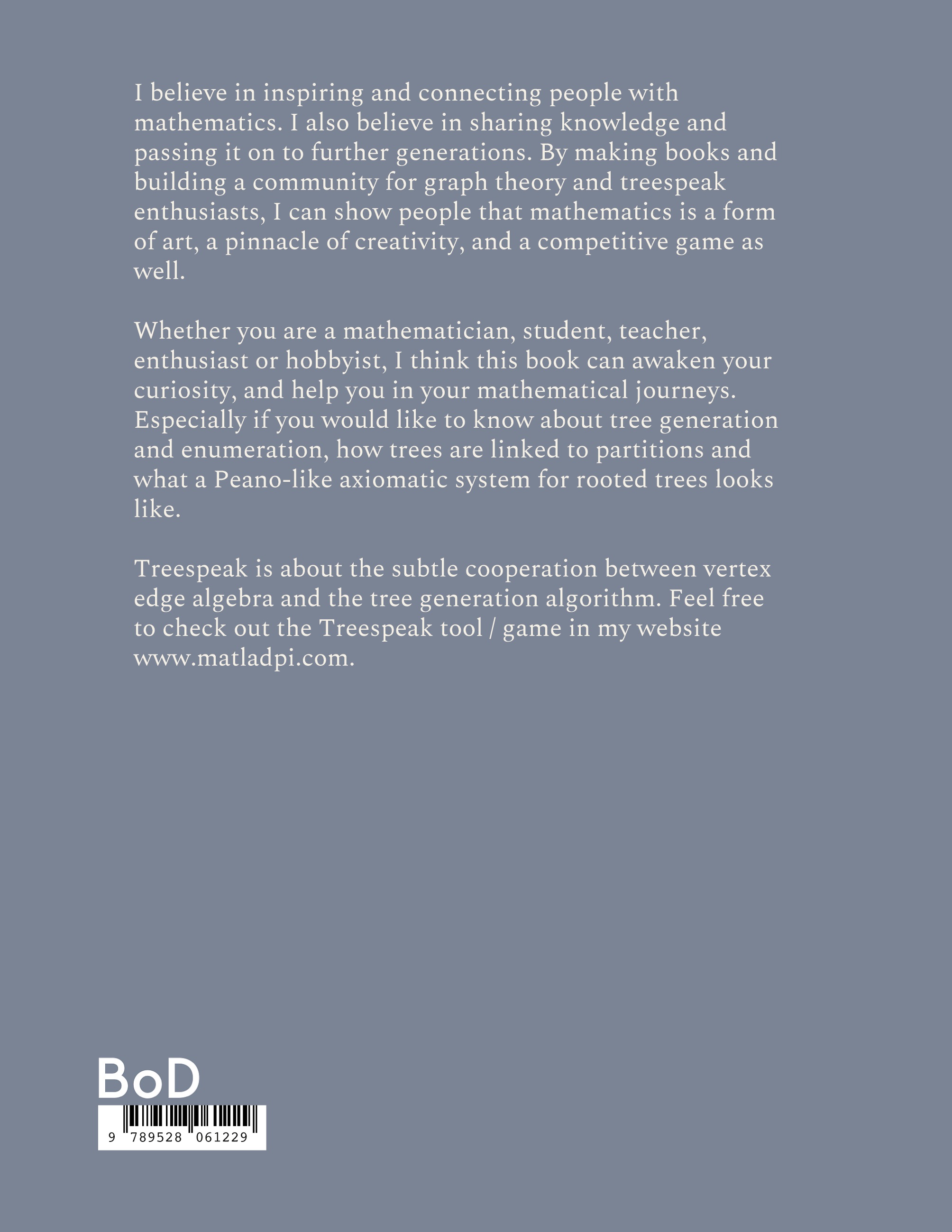 I believe in inspiring and connecting people with mathematics. I also believe in sharing knowledge and passing it on to further generations. By making books and building a community for graph theory and treespeak enthusiasts, I can show people that mathematics is a form of art, a pinnacle of creativity, and a competitive game as well. Whether you are a mathematician, student, teacher, enthusiast or hobbyist, I think this book can awaken your curiosity, and help you in your mathematical journeys. Especially if you would like to know about tree generation and enumeration, how trees are linked to partitions and what a Peano-like axiomatic system for rooted trees looks like.Treespeak is about the subtle cooperation between vertex edge algebra and the tree generation algorithm. Feel free to check out the Treespeak tool / game in my website www.matladpi.com.