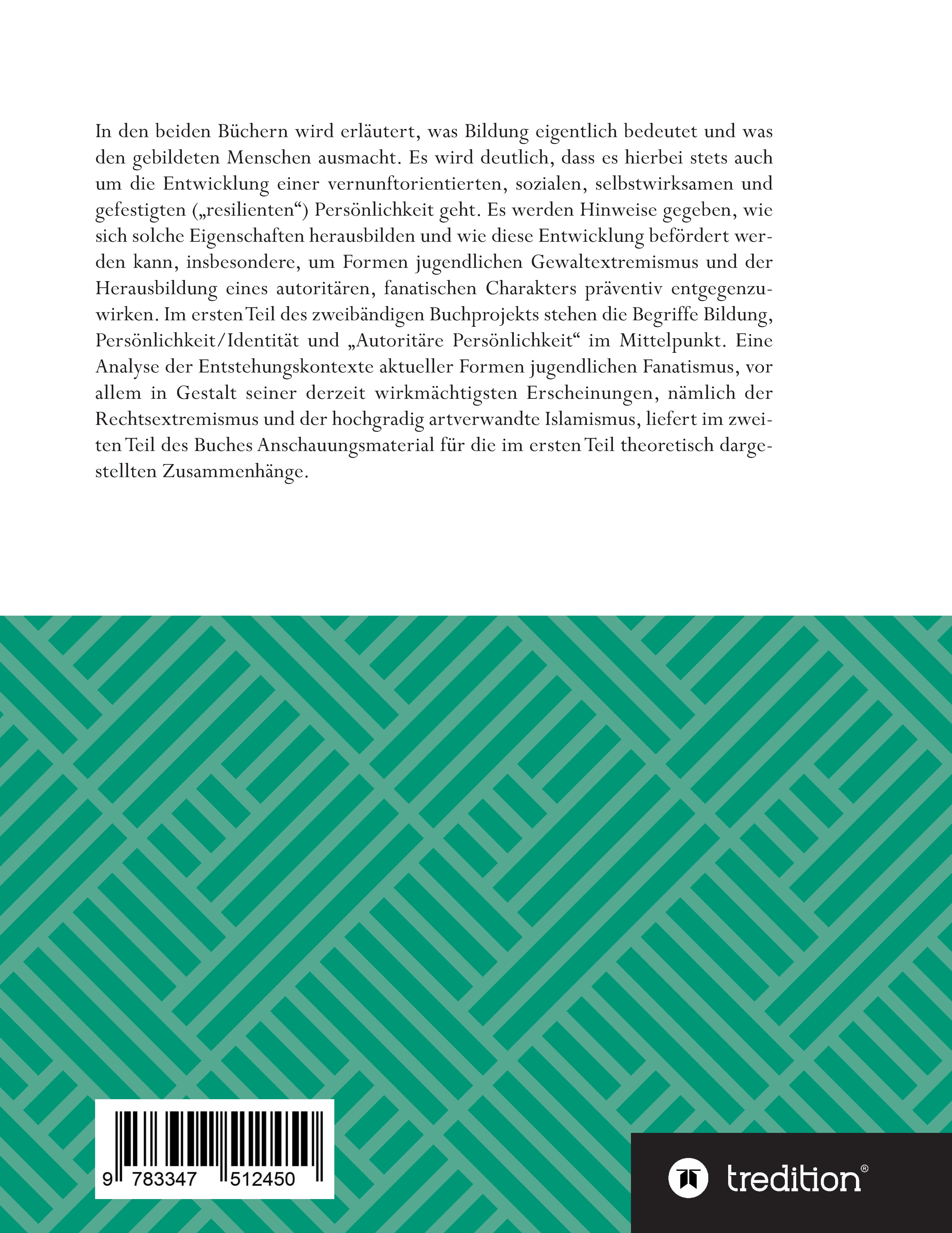 In den beiden Büchern wird erläutert, was Bildung eigentlich bedeutet und was den gebildeten Menschen ausmacht. Es wird deutlich, dass es hierbei stets auch um die Entwicklung einer vernunftorientierten, sozialen, selbstwirksamen und gefestigten ("resilienten") Persönlichkeit geht. Es werden Hinweise gegeben, wie sich solche Eigenschaften herausbilden und wie diese Entwicklung befördert werden kann, insbesondere, um Formen jugendlichen Gewaltextremismus und der Herausbildung eines autoritären, fanatischen Charakters präventiv entgegenzuwirken. Im ersten Teil des zweibändigen Buchprojekts stehen die Begriffe Bildung, Persönlichkeit/Identität und "Autoritäre Persönlichkeit" im Mittelpunkt. Eine Analyse der Entstehungskontexte aktueller Formen jugendlichen Fanatismus, vor allem in Gestalt seiner derzeit wirkmächtigsten Erscheinungen, nämlich Rechtsextremismus und der hochgradig artverwandte Islamismus, liefert im zweiten Teil des Buches Anschauungsmaterial für die im ersten Teil theoretisch dargestellten Zusammenhänge.