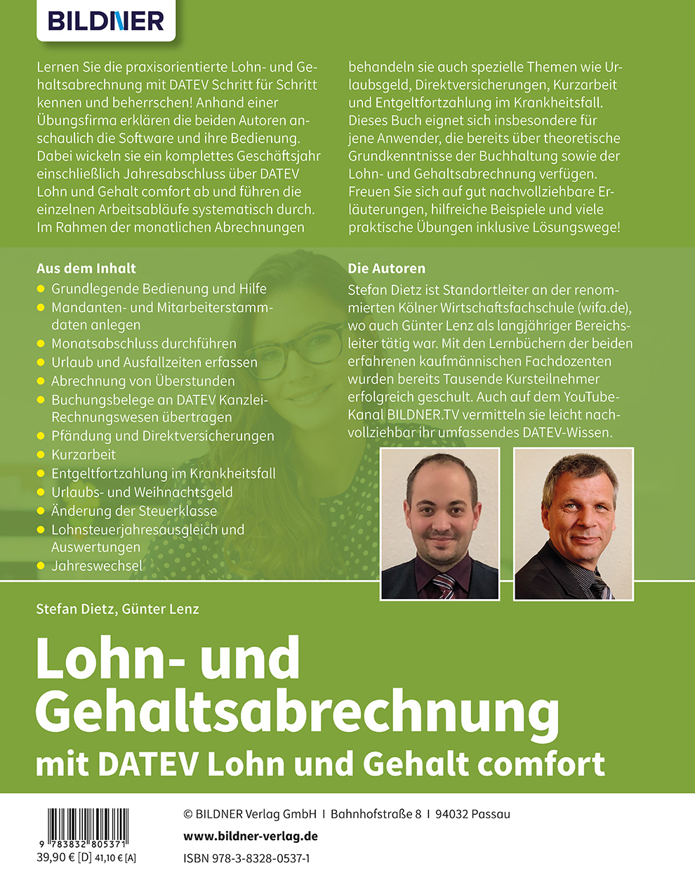 Stefan Dietz ist Standortleiter an der renommierten Kölner Wirtschaftsfachschule (wifa.de), wo auch Günter Lenz als langjähriger Bereichsleiter tätig war. Mit den Lernbüchern der beiden erfahrenen kaufmännischen Fachdozenten wurden bereits Tausende Kursteilnehmer erfolgreich geschult. Auch auf dem YouTube-Kanal BILDNER.TV vermitteln sie leicht nachvollziehbar ihr umfassendes DATEV-Wissen.