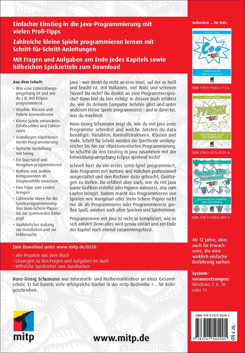 Schnell hast du ein erstes Lotto-Spiel programmiert, dein Programm mit Buttons und Häkchen professionell ausgestattet und den Rechner dazu gebracht, Quizfragen zu stellen. Du kannst mit Java aber auch bunte Grafiken erstellen oder Figuren animieren. Zudem macht das Programmieren von Spielen wie Hang-Man oder Stein-Schere-Papier nicht nur dir als Programmierer oder Programmiererin großen Spaß.