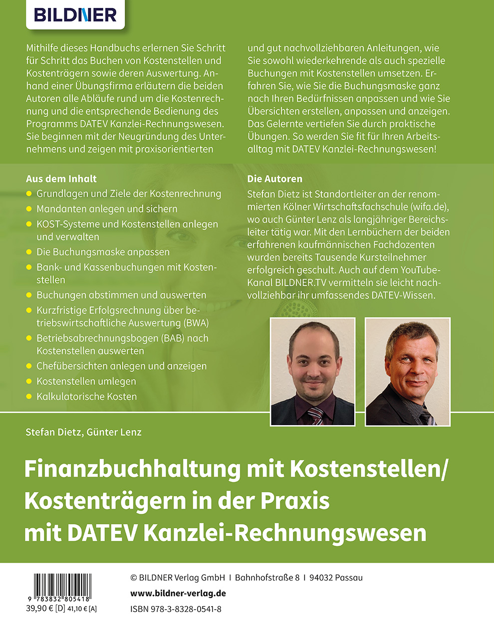 Mithilfe dieses Handbuchs erlernen Sie Schritt für Schritt das Buchen von Kostenstellen und Kostenträgern sowie deren Auswertung. Anhand einer Übungsfirma erläutern die beiden Autoren alle Abläufe rund um die Kostenrechnung und die entsprechende Bedienung des Programms DATEV Kanzlei-Rechnungswesen.