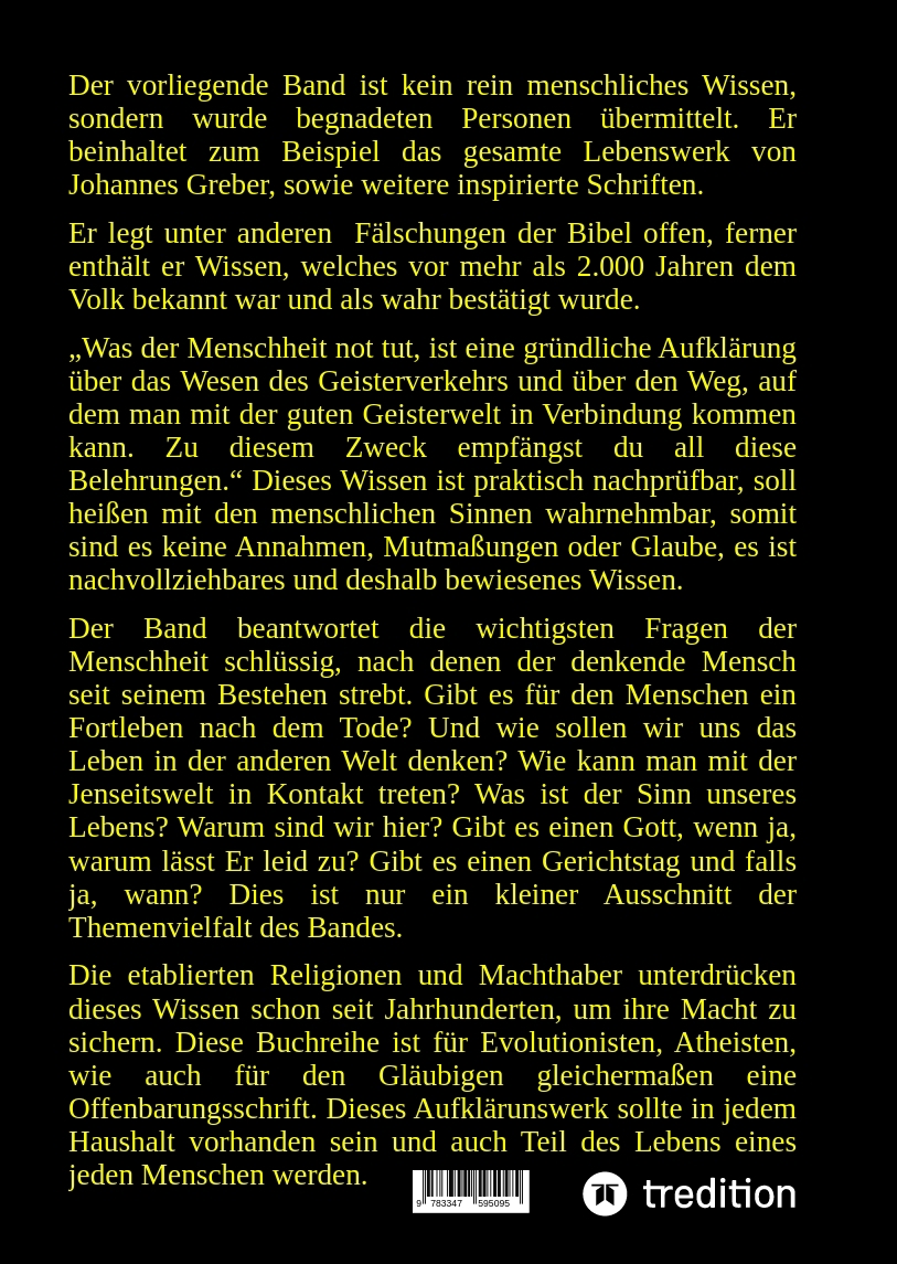 Das Buch beinhaltet Schriften mehrerer Personen, wie zum Beispiel, daß gesamte Lebenswerk von Johannes Greber. Johannes Greber wurde am 2. Mai 1874 in 54470 Bernkastel geboren. Er war ein katholischer Priester, Reichstagsabgeordneter und Leiter eines Hilfsbundes. Johannes Greber empfing in einer spiritistischen Gruppe die wichtigsten Informationen für uns Menschen. Er schrieb die Hauptteile des vorliegenden Werkes. Er starb am † 31. März 1944 in New York. Ihm wurden die Informationen auf demselben Weg übermittelt, wie die inspirierten Schriften der alten Zeit. Seine Schriften sind das wahre Wort Gottes. Zitat: „Was der Menschheit not tut, ist eine gründliche Aufklärung über das Wesen des Geisterverkehrs und über den Weg, auf dem man mit der guten Geisterwelt in Verbindung kommen kann. Und das soll deine Lebensaufgabe sein. Zu diesem Zweck empfängst du alle diese Belehrungen. Sie sind nicht bloß für dich, sondern für deine Mitmenschen bestimmt.“