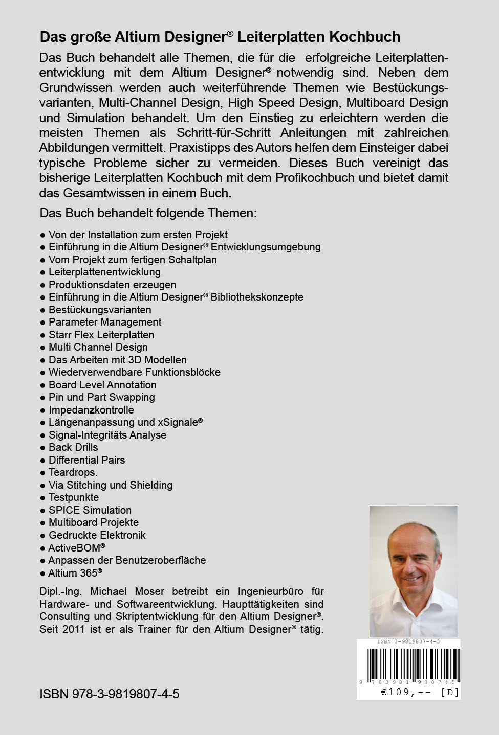 Das Buch behandelt alle Themen, die für die erfolgreiche Leiterplattenentwicklung mit dem Altium Designer® notwendig sind. Neben dem Grundwissen werden auch weiterführende Themen wie Bestückungsvarianten, Multi-Channel Design, High Speed Design, varianten, Multiboard Design und Simulation behandelt. Um den Einstieg zu erleichtern werden die